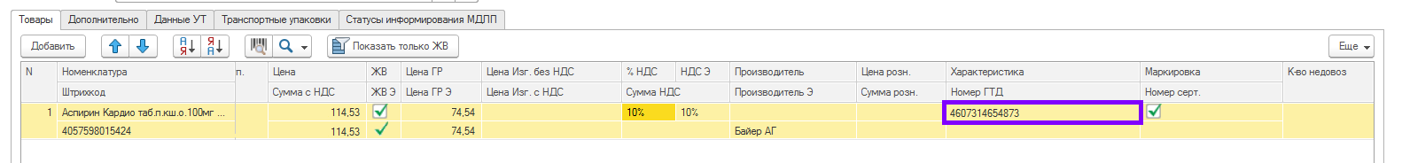 При проведении документа из УТ придет характеристика. Нажав сочетание клавиш «CTRL+F», раскройте характеристику для проверки проставления признака маркировки.