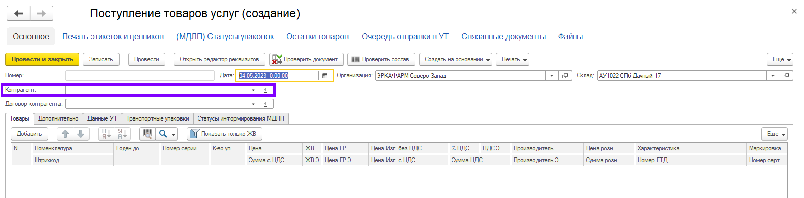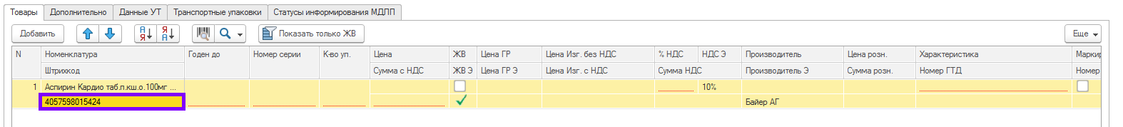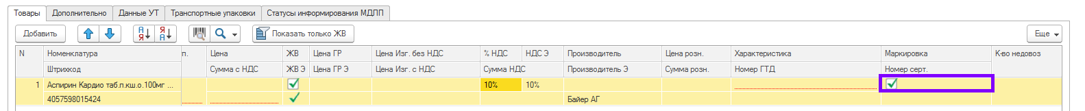 В случае если вам пришел маркированный препарат от поставщика, работающего по прямому акцепту, проставьте «галочку» в столбце «Маркировка».