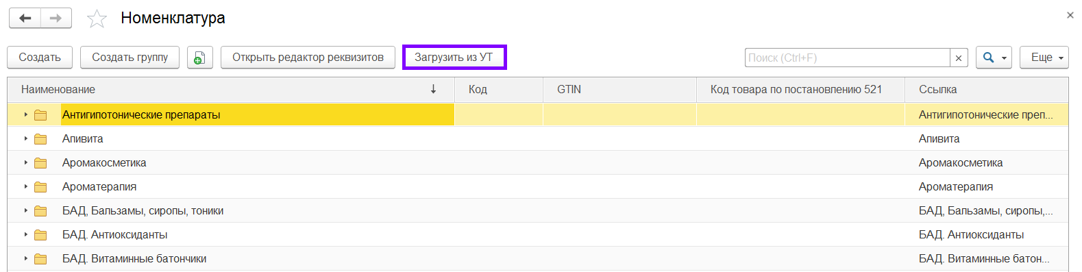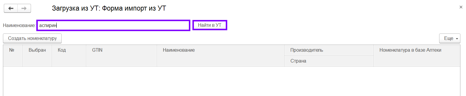 Ввести номенклатуру и нажать на кнопку «Найти в УТ».