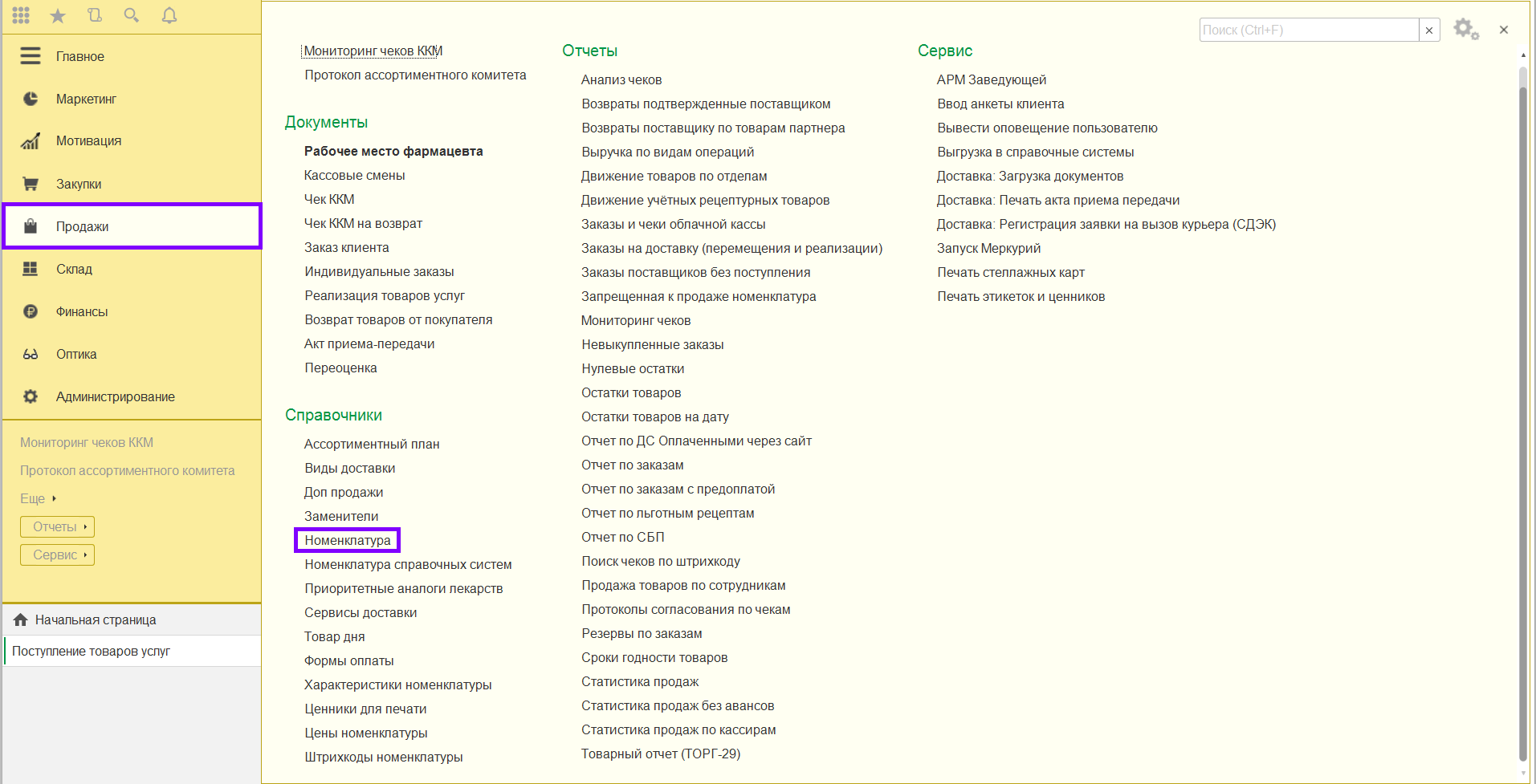 Для этого необходимо перейти во вкладку Продажи - Справочники – Номенклатура.
