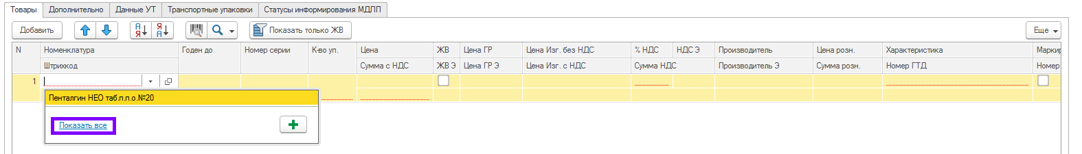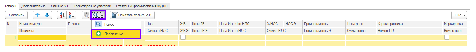 Для добавления товара через номенклатуру нажмите кнопку «Добавить». После нажатия появляется новая пустая строчка.