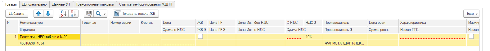 Внесите товар в табличную часть путем считывания штрихкода с упаковки.