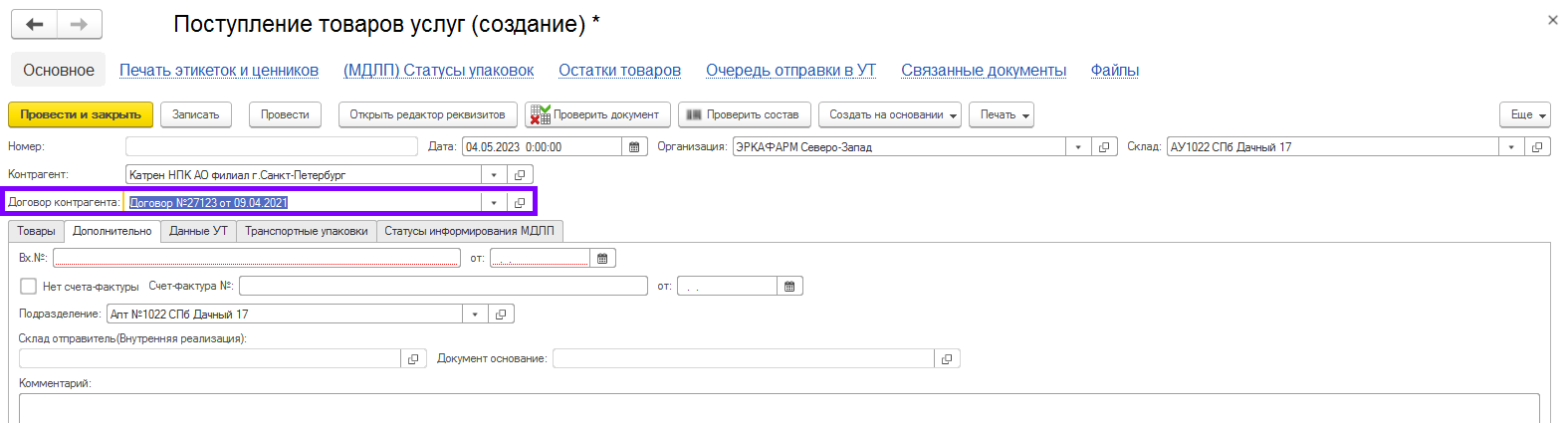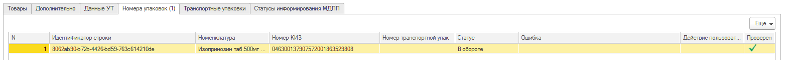 После проведения документа, поступление будет загружено в УТ 11.5, где свяжется с уведомлением поставщика по «прямому акцепту». Далее вам выгрузятся в СОФТ данные по КиЗ из уведомления. Выгрузку вы можете увидеть во вкладке «Номера упаковок» и «Транспортные упаковки» соответственно.