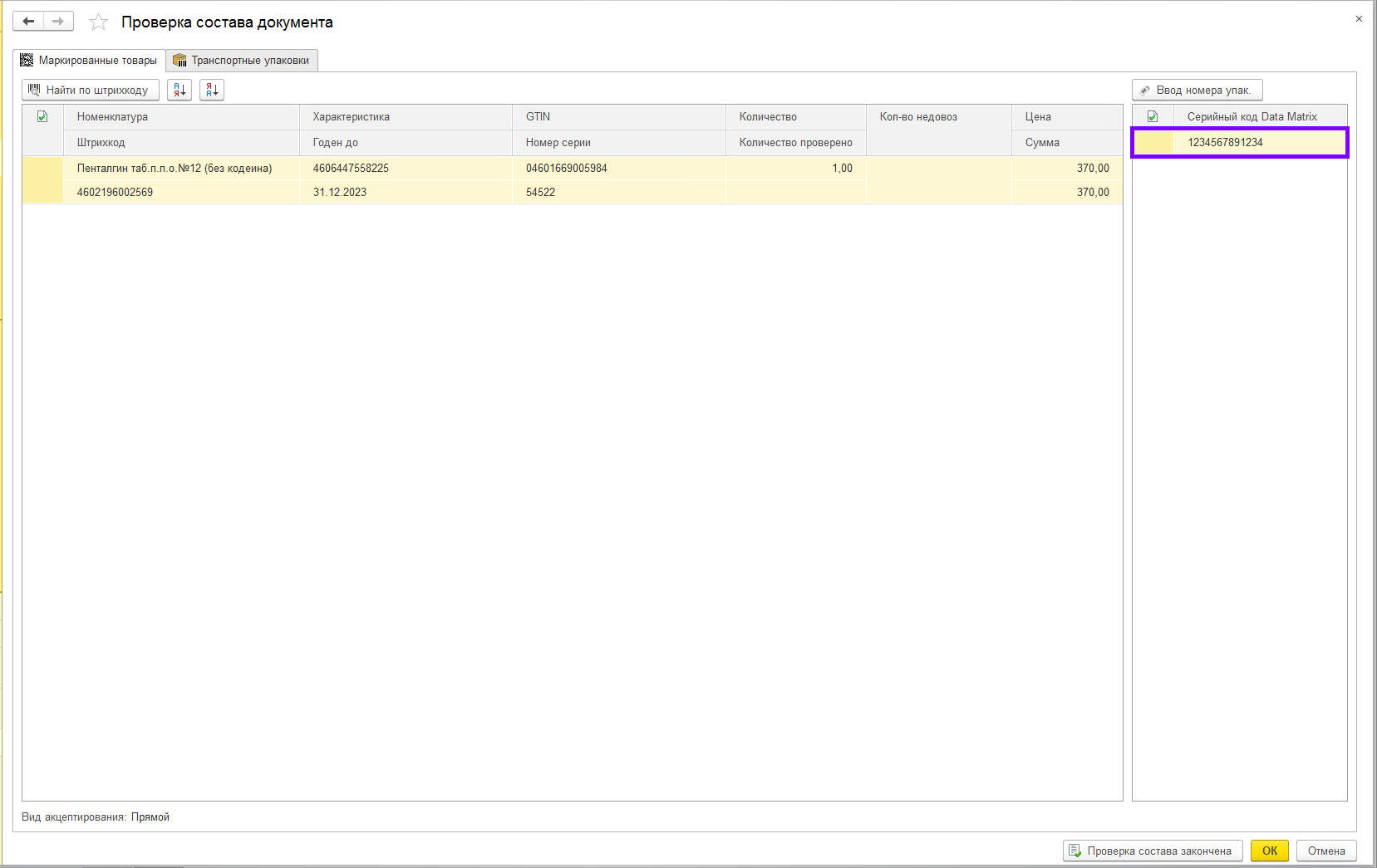 Пройдите проверку состава маркированного товара. При прямом акцепте серийный код упаковки будет заполнен. Отсканируйте Data Matrix код с упаковки.