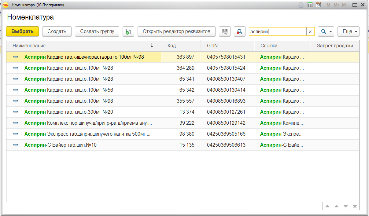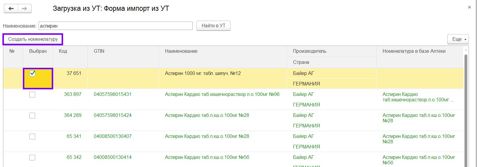 Номенклатура, которая уже есть в базе Вашей аптеки будет подсвечена зелёным цветом.