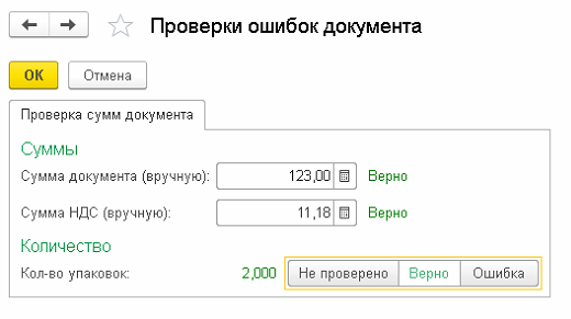 - внесите итоговую сумму документа с НДС и сумму НДС, подтвердите правильность указанного количества товаров;