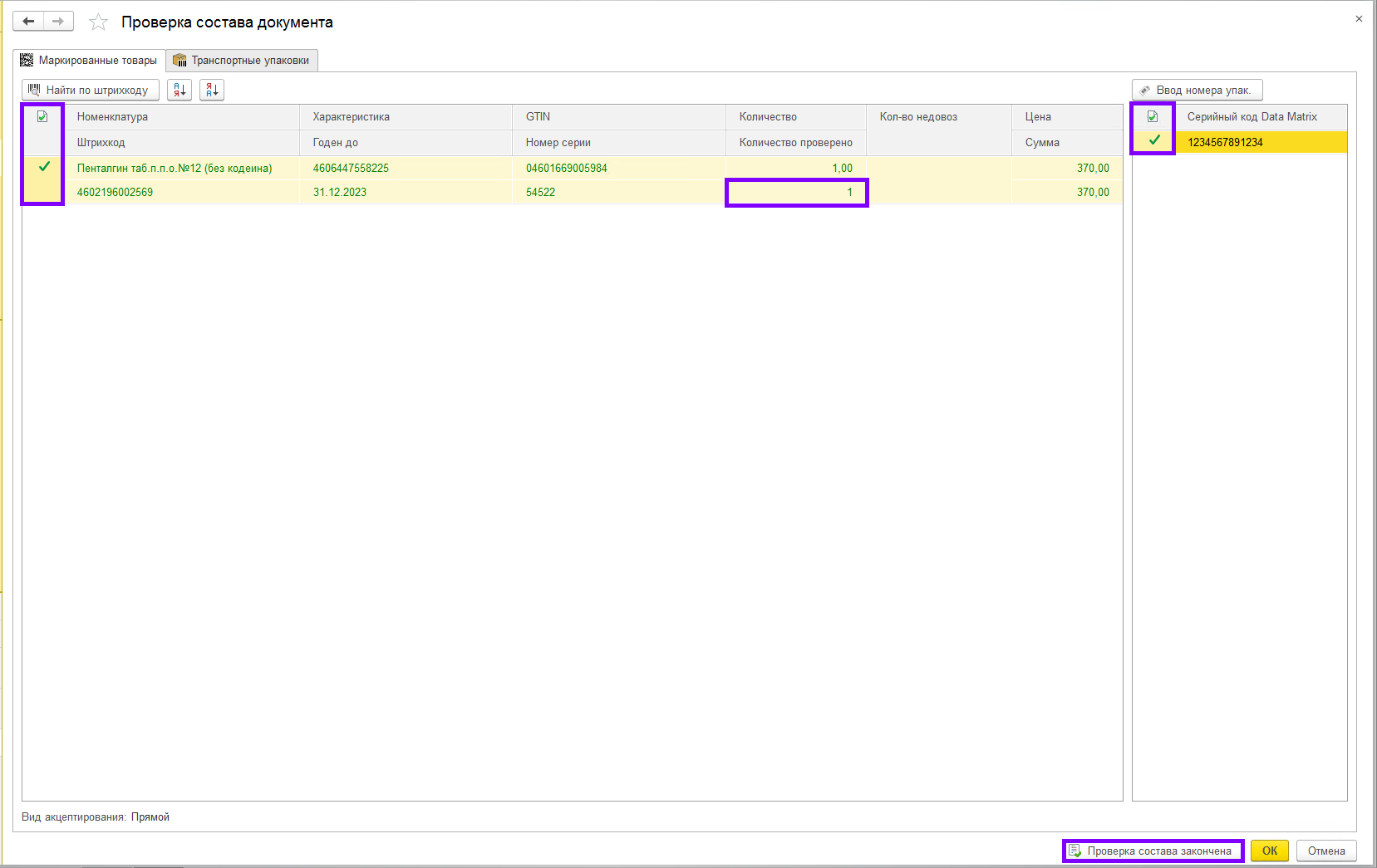 После сканирования у вас взведутся галки проверки и проставится «Количество проверено», после сканирования всего маркированного товара из накладной завершите проверку состава, нажав кнопку «Проверка состава закончена».