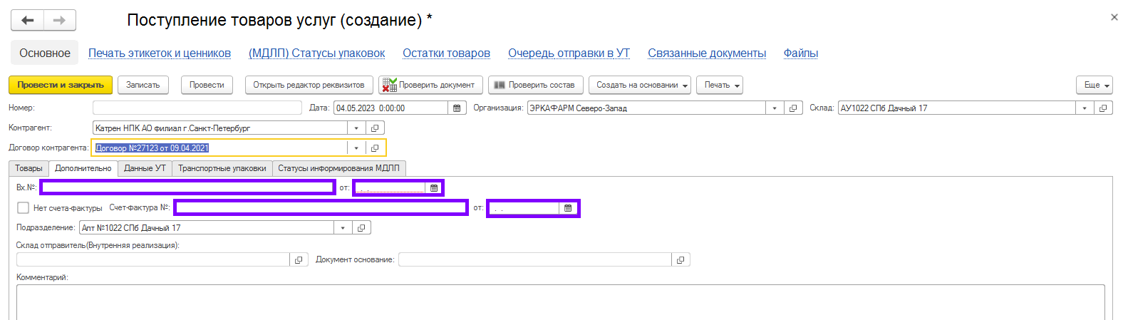 Укажите номера и даты накладной и счета-фактуры на вкладке «Дополнительно».