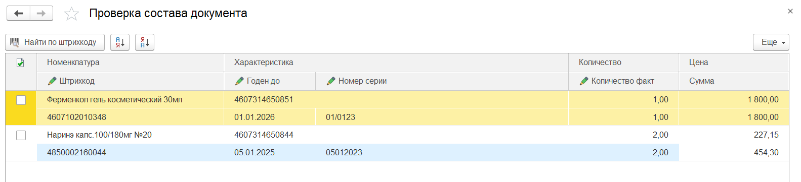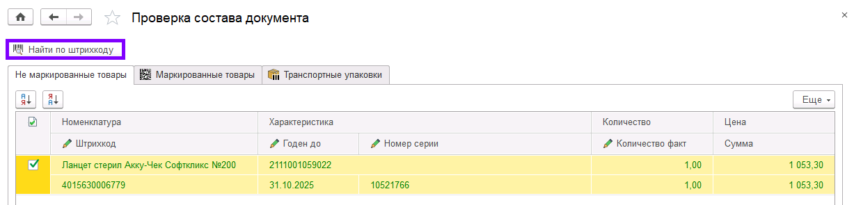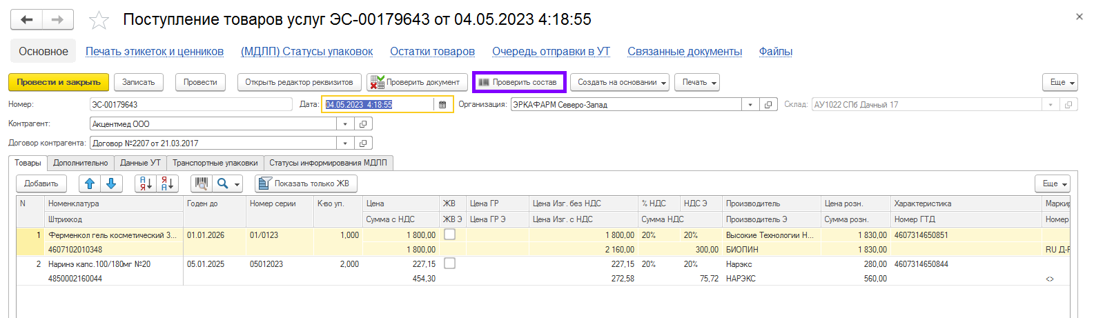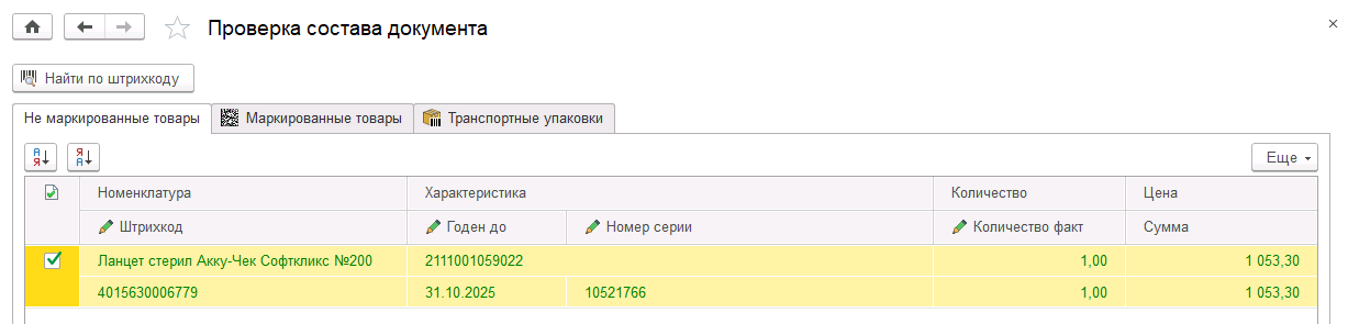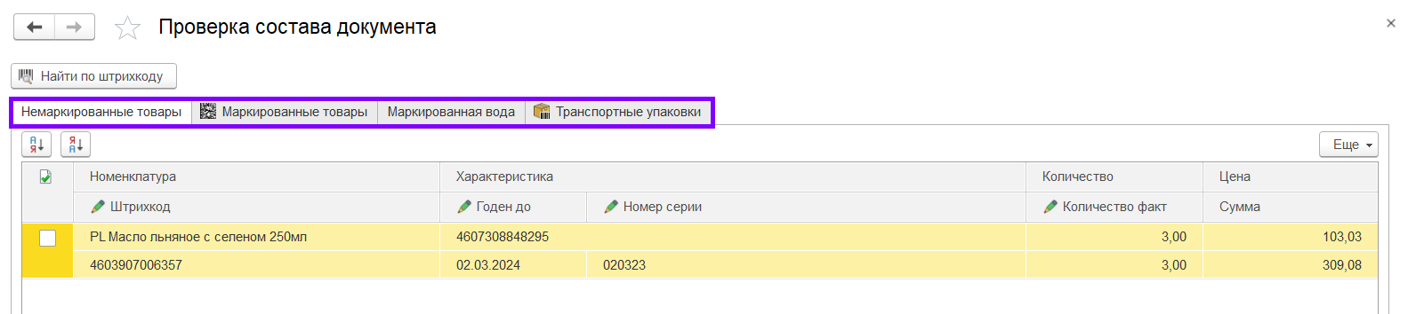 При наличии в накладной маркированного товара, в проверке состава будет сразу несколько вкладок: