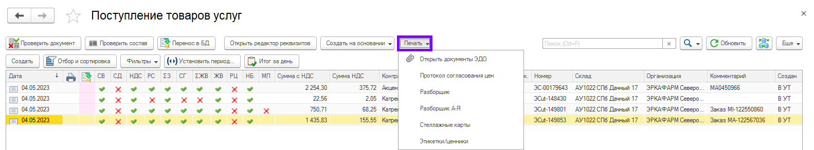 Также можно проверить состав документа распечатав «Разборщик» через меню «Печать» -> «Разборщик».
