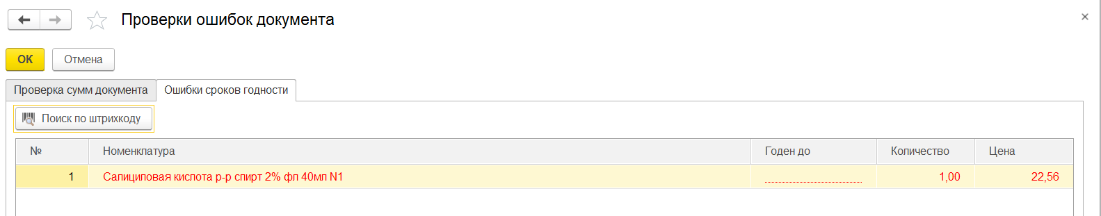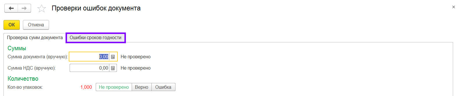 Если в документе есть проблемы со сроками годности, в журнале документов в накладной будет стоять отметка X в столбце «СГ». При открытии накладной в разделе «Проверить документ» будет отражена вкладка «Ошибки сроков годности» с перечнем товаров, по которым необходимо внести исправления.