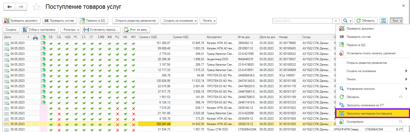 Для этого нажимаем кнопку «Ещё»> «Загрузить накладные поставщика».