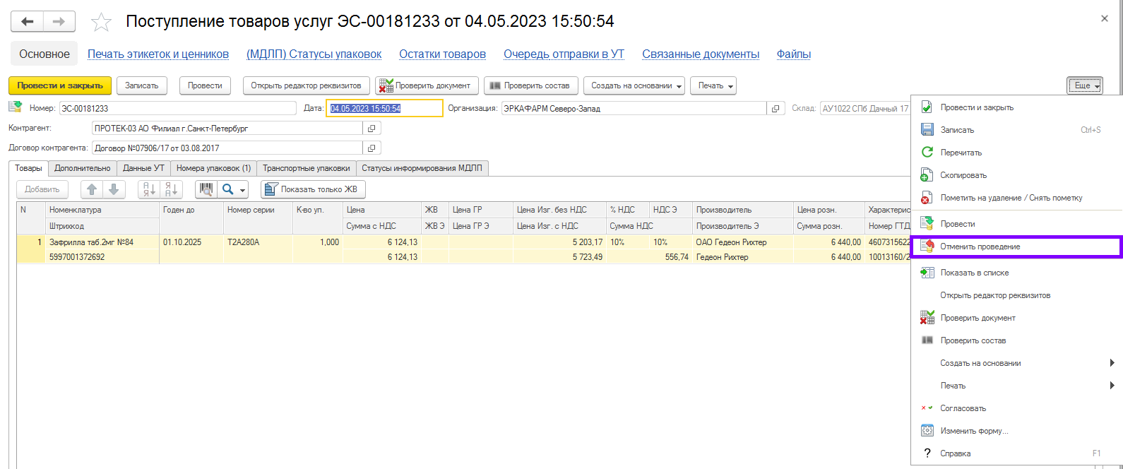 Для этого нужно открыть документ двойным нажатием левой кнопки мыши и развернуть список действий через кнопку «Ещё» и выбрать «Отменить проведение».