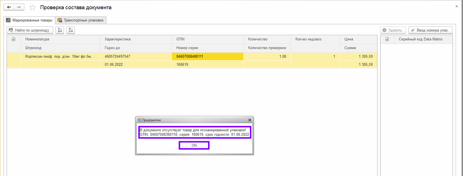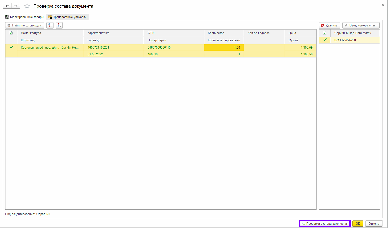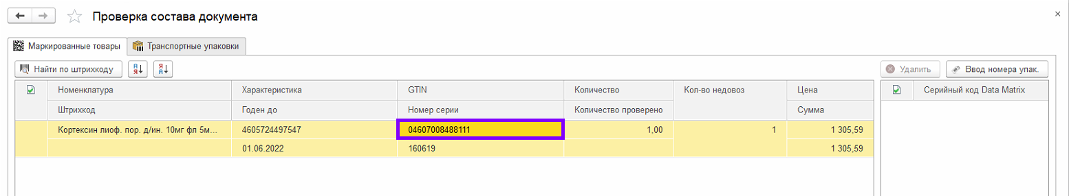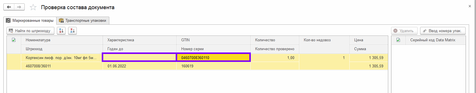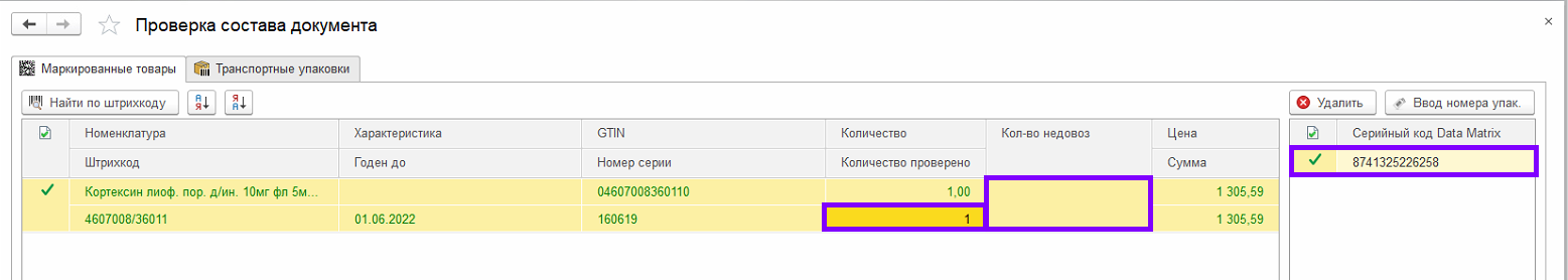 Отсканируйте упаковку в «Проверку состава», заполнится серийный номер и очистятся данные в поле «Кол-во недовоз».