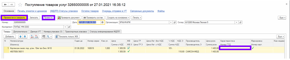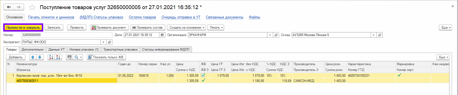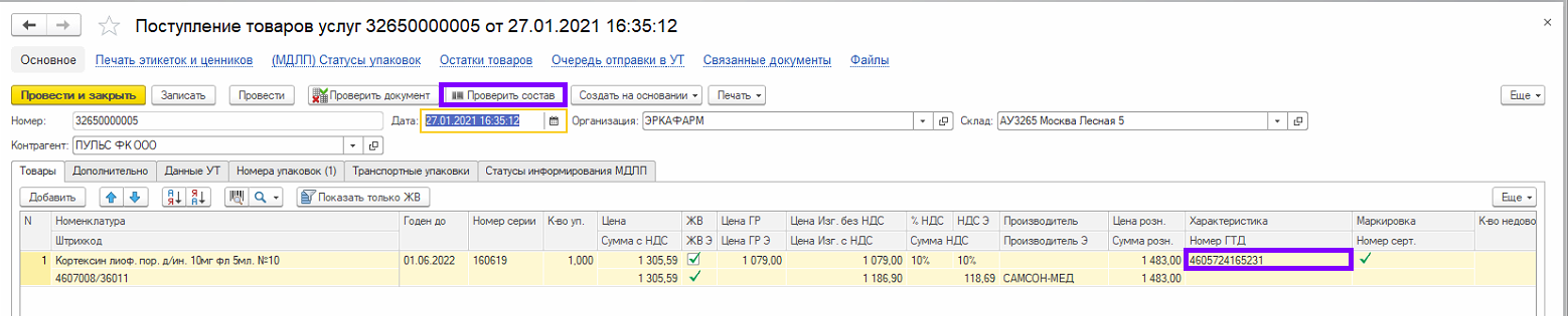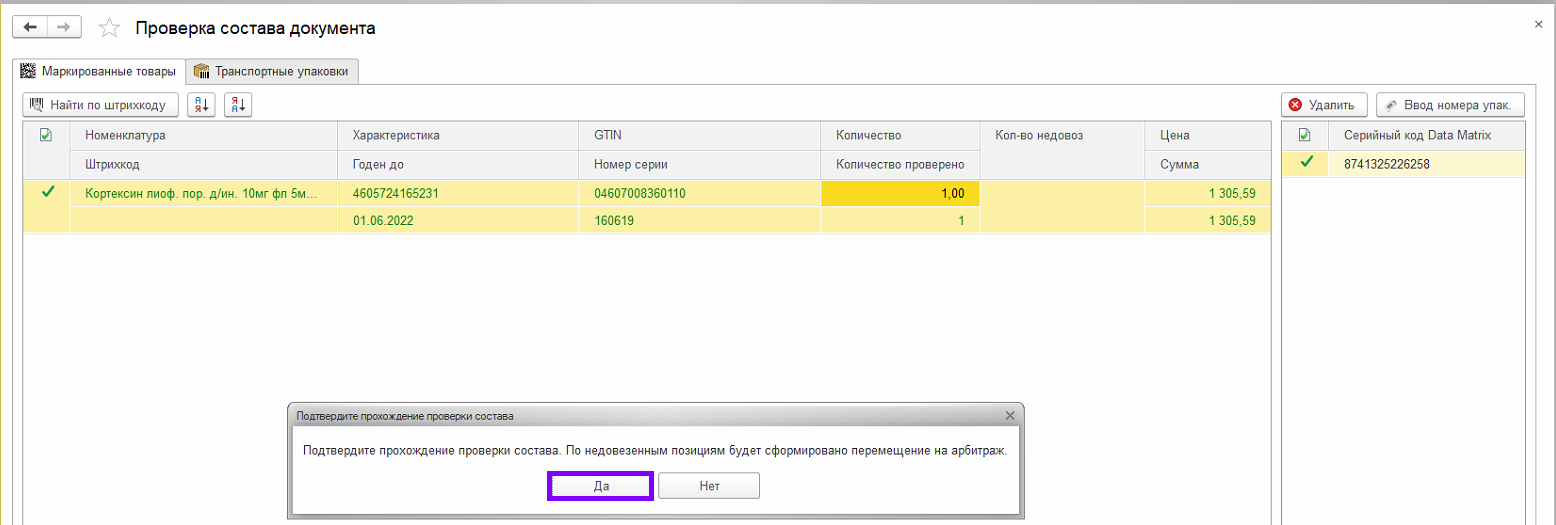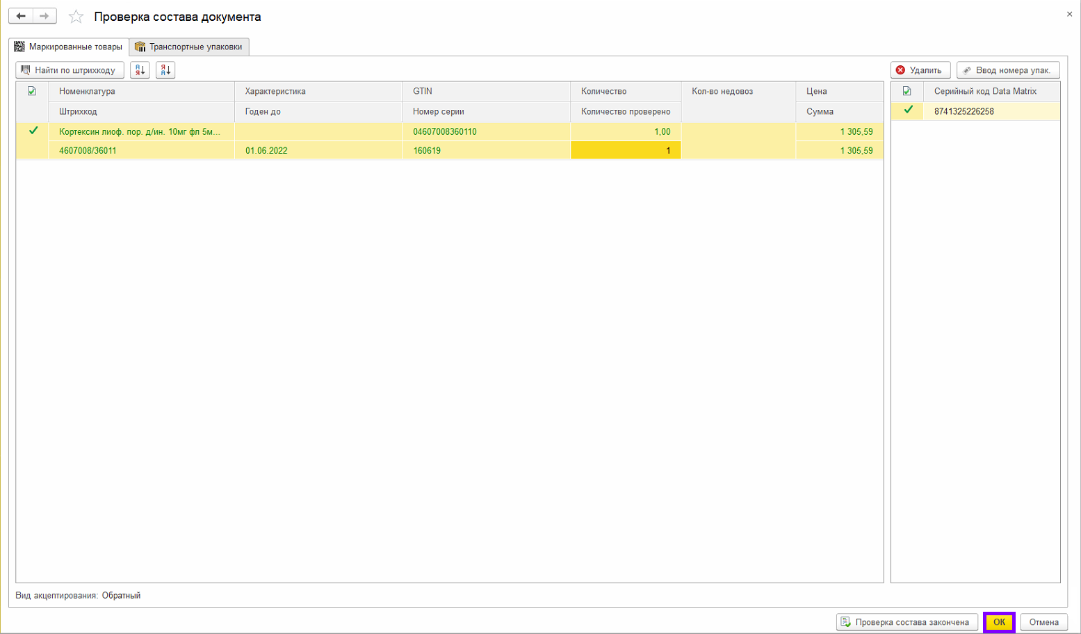 Отсканируйте упаковку в «Проверку состава», заполнится серийный номер и очистятся данные в поле «Кол-во недовоз».