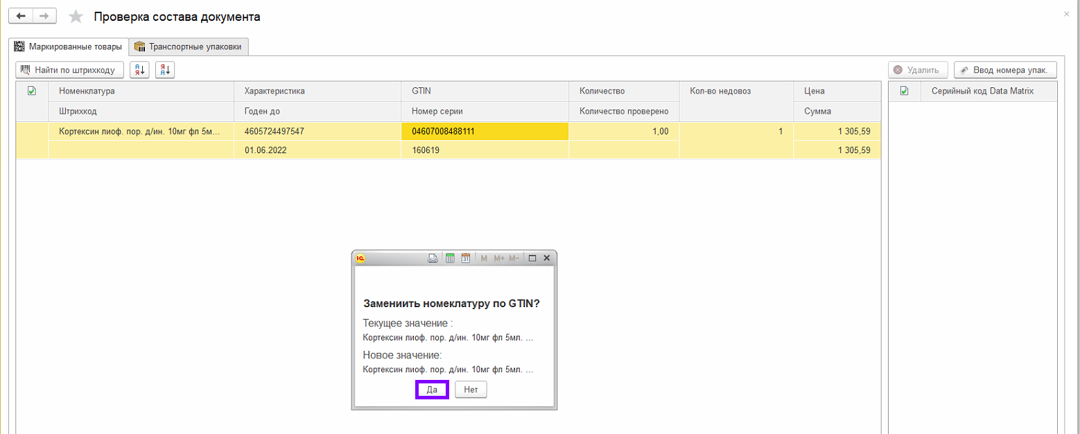 Система предложит заменить текущую номенклатуру в документе на номенклатуру с корректным GTIN. Нажмите «Да».