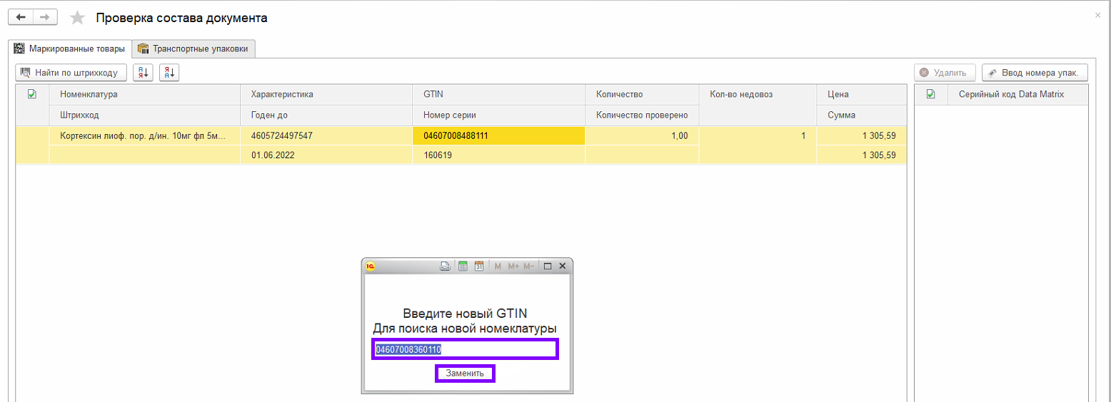 В открывшемся окне отсканируйте Data Matrix с упаковки и нажмите кнопку «Заменить».