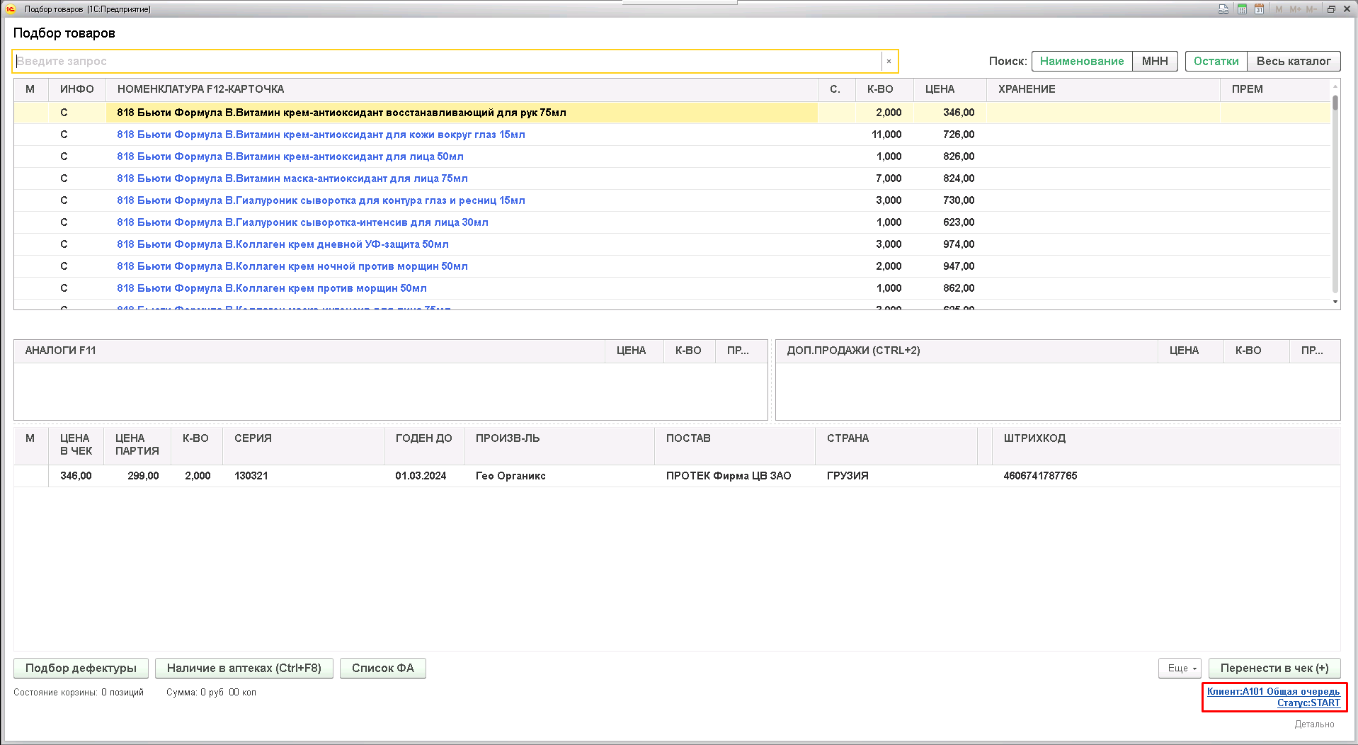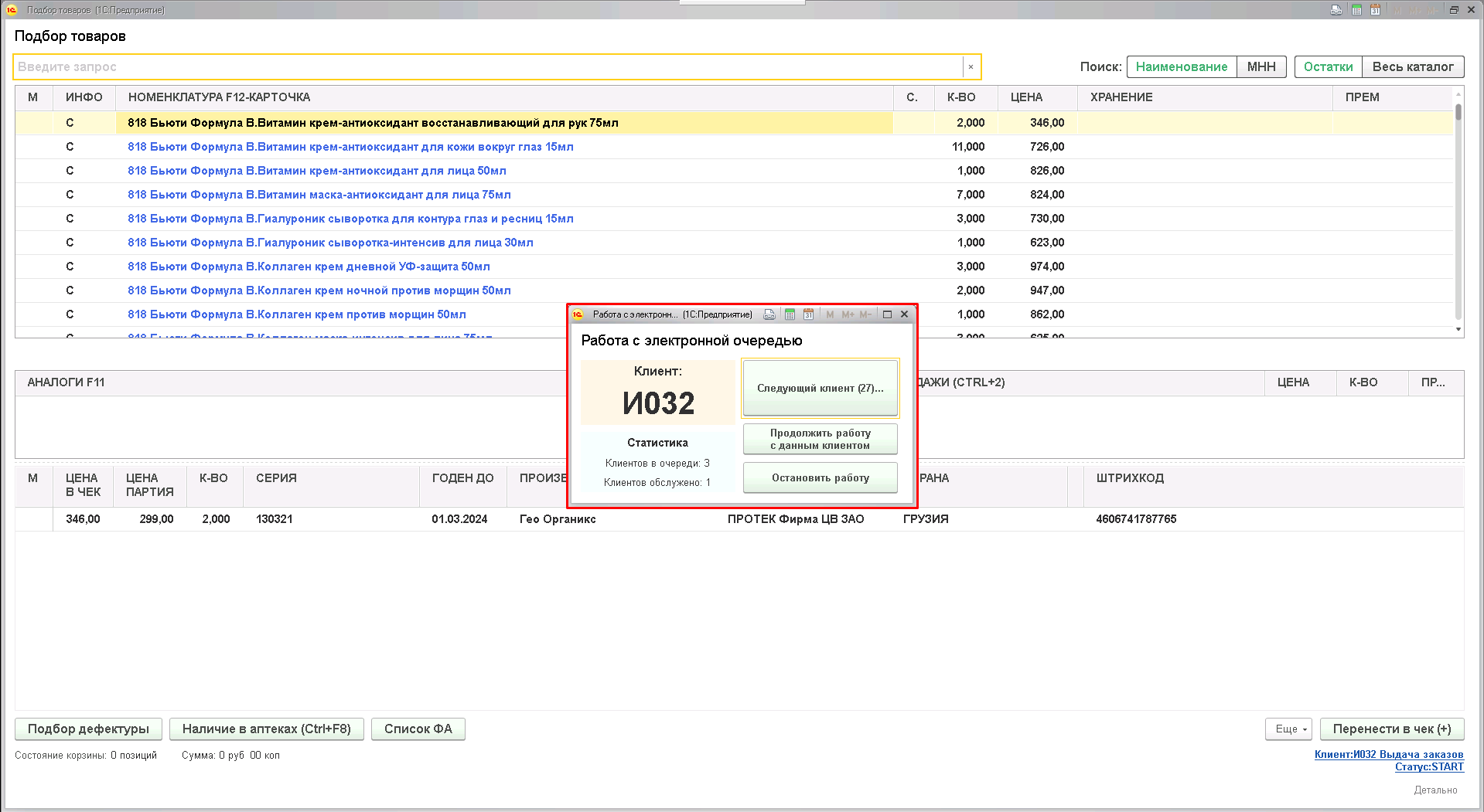 - В форме «Подбор товаров» также присутствует возможность открытия пульта электронной очереди.