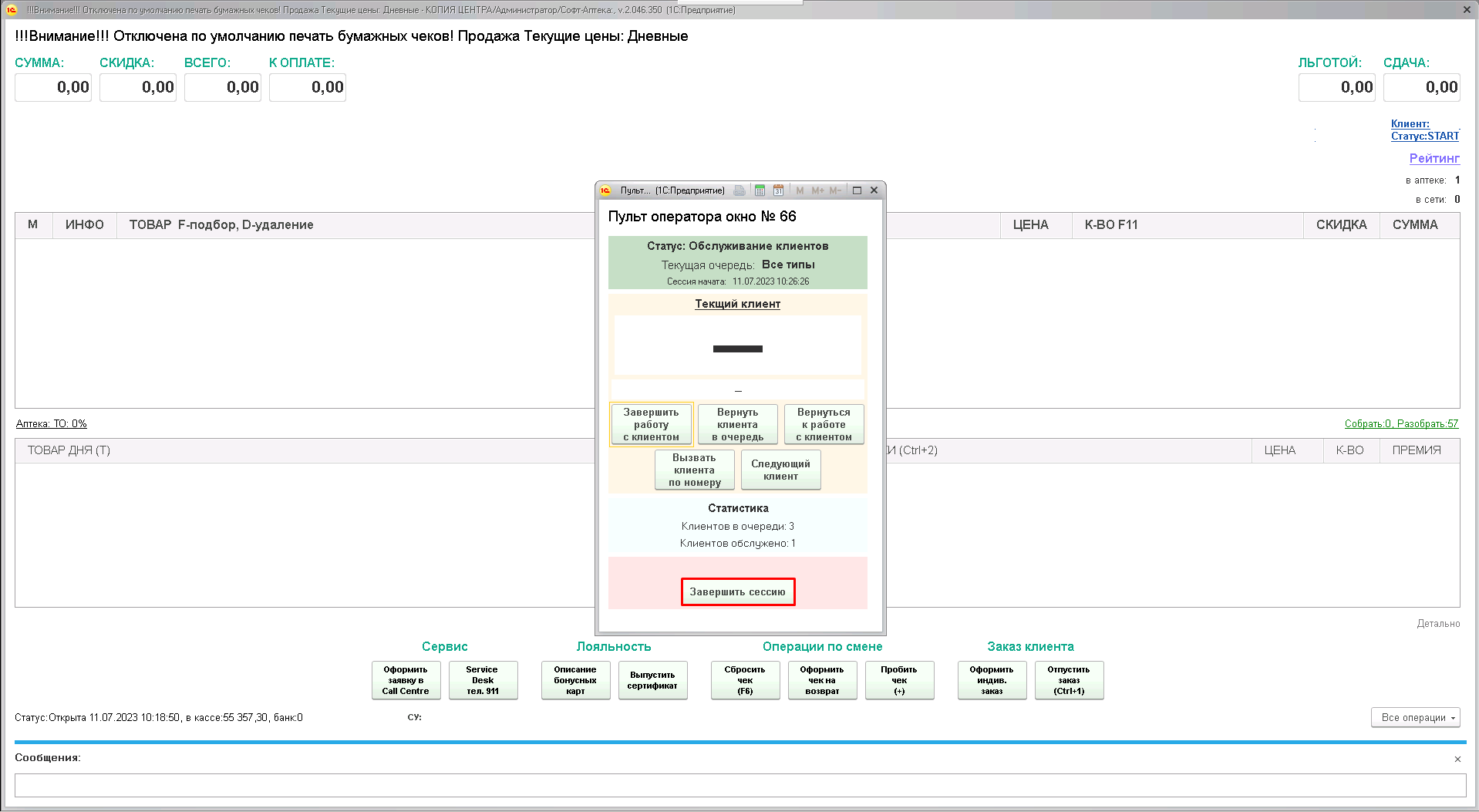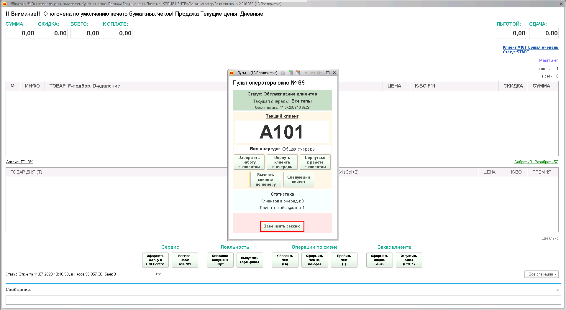 - Для завершения работы с электронной очередью нажмите кнопку «Завершить сессию».