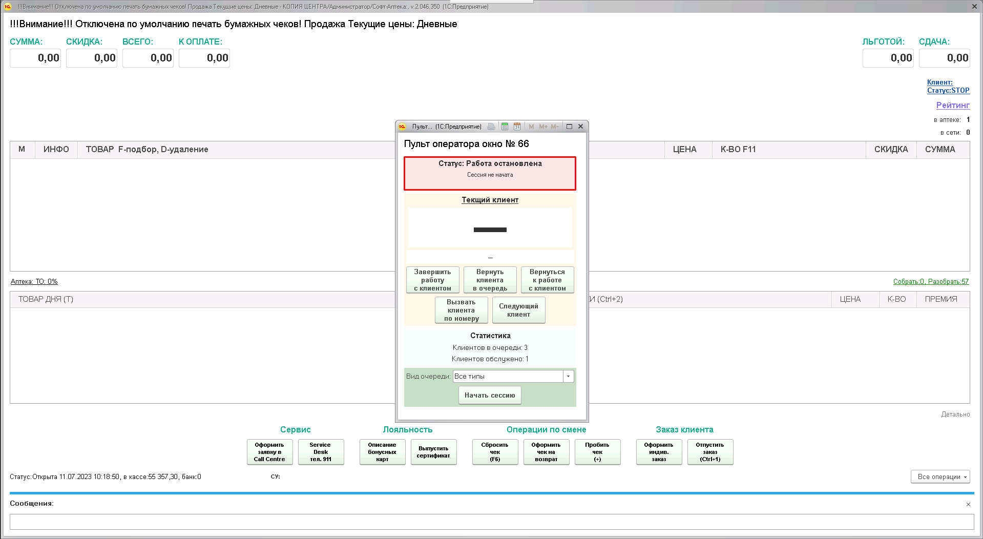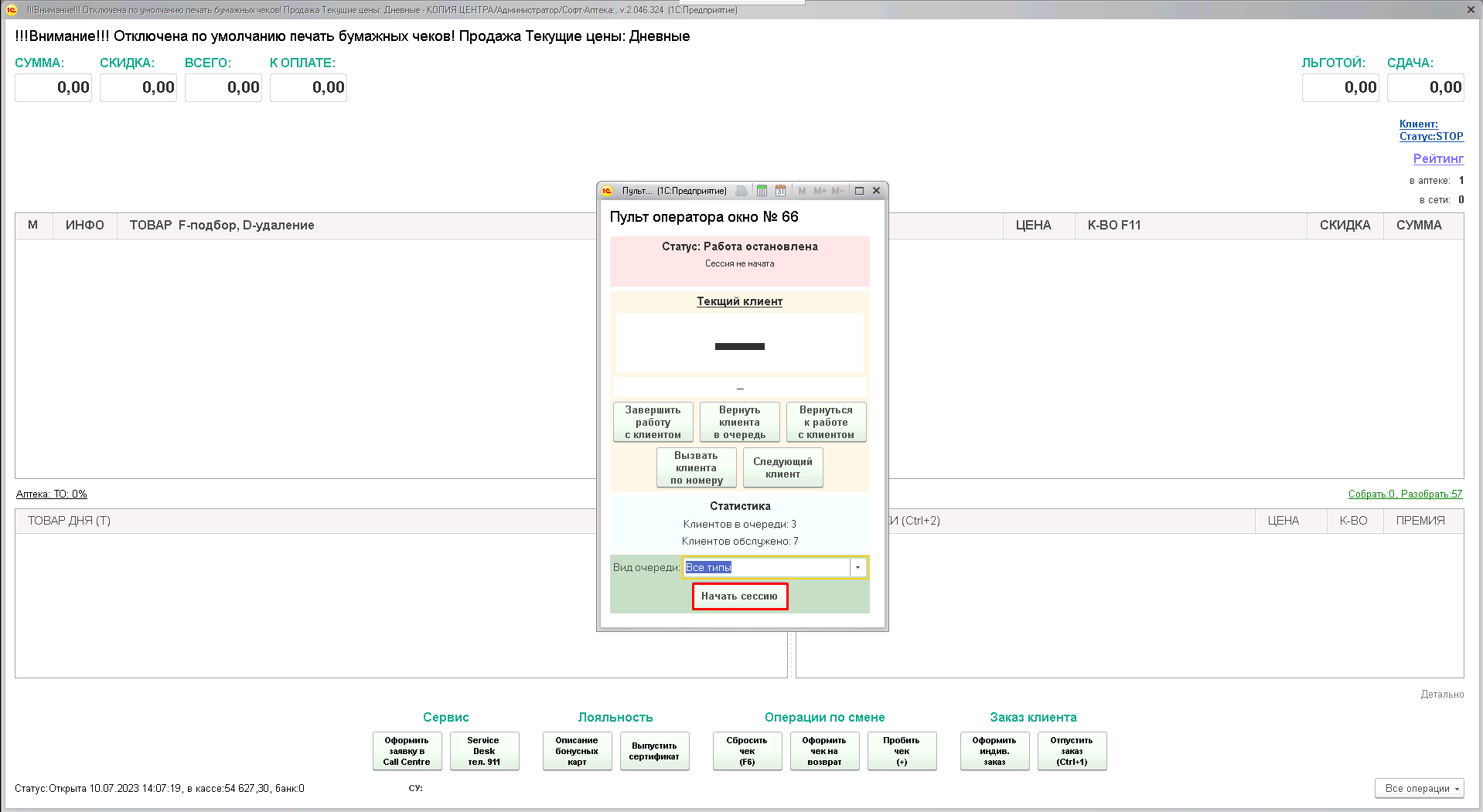 - При необходимости остановить работу на кассе (перерыв, обед, закрытие на разбор товара и т.д.) – нажмите кнопку «Остановить работу». Для возобновления работы нажмите кнопку «Начать сессию» согласно первому пункту инструкции.
