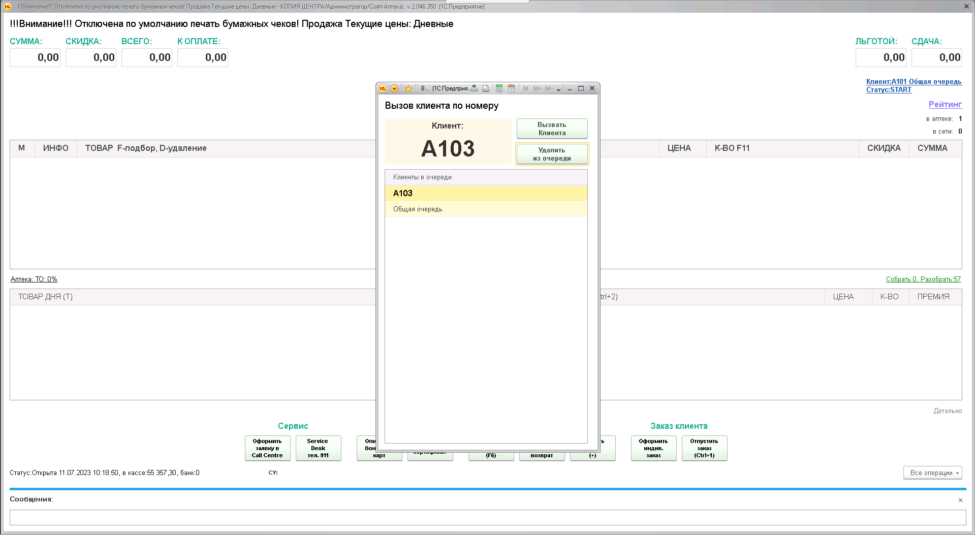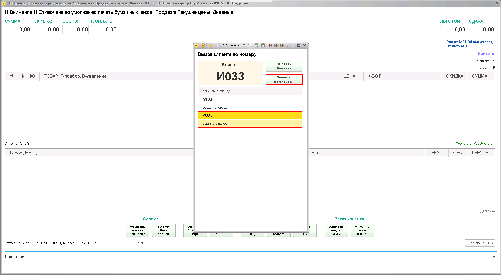 - В случае если клиент не дождался очереди и ушел из аптеки, для аннулирования номерка нажмите кнопку «Удалить из очереди».