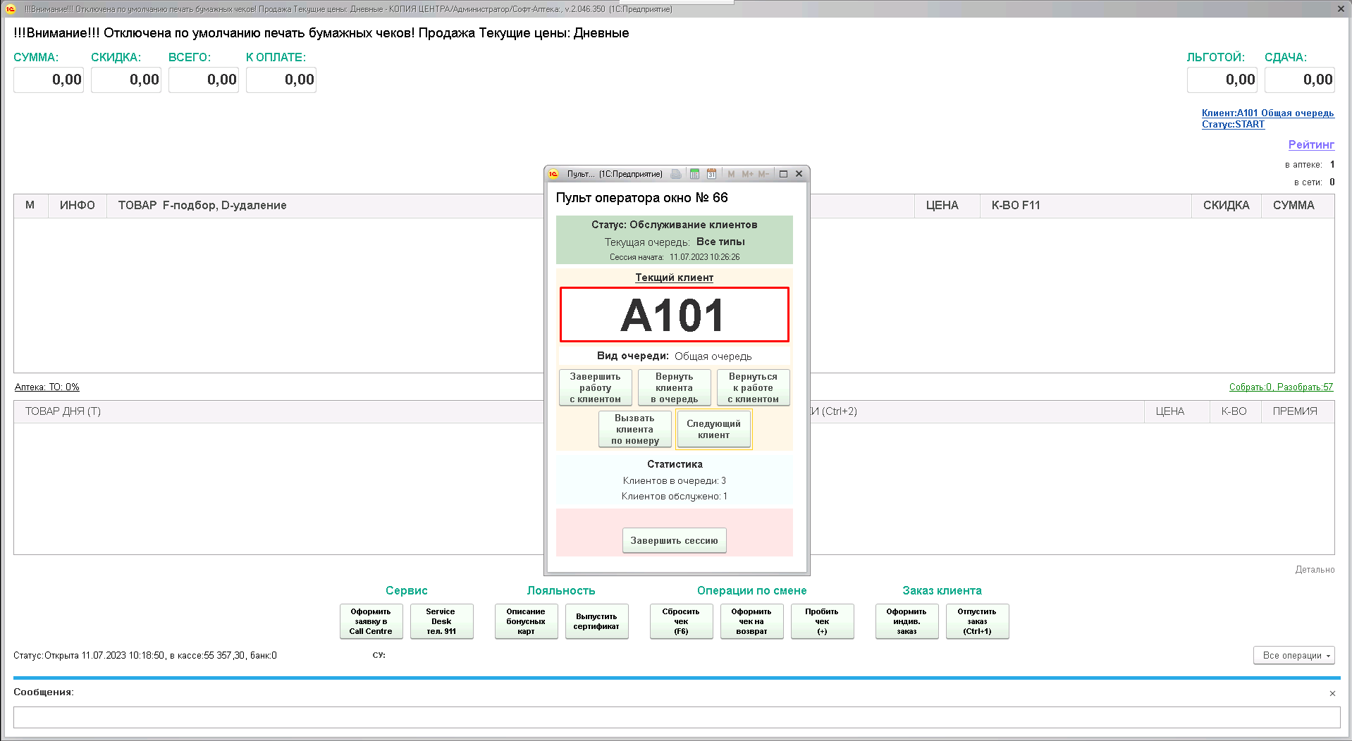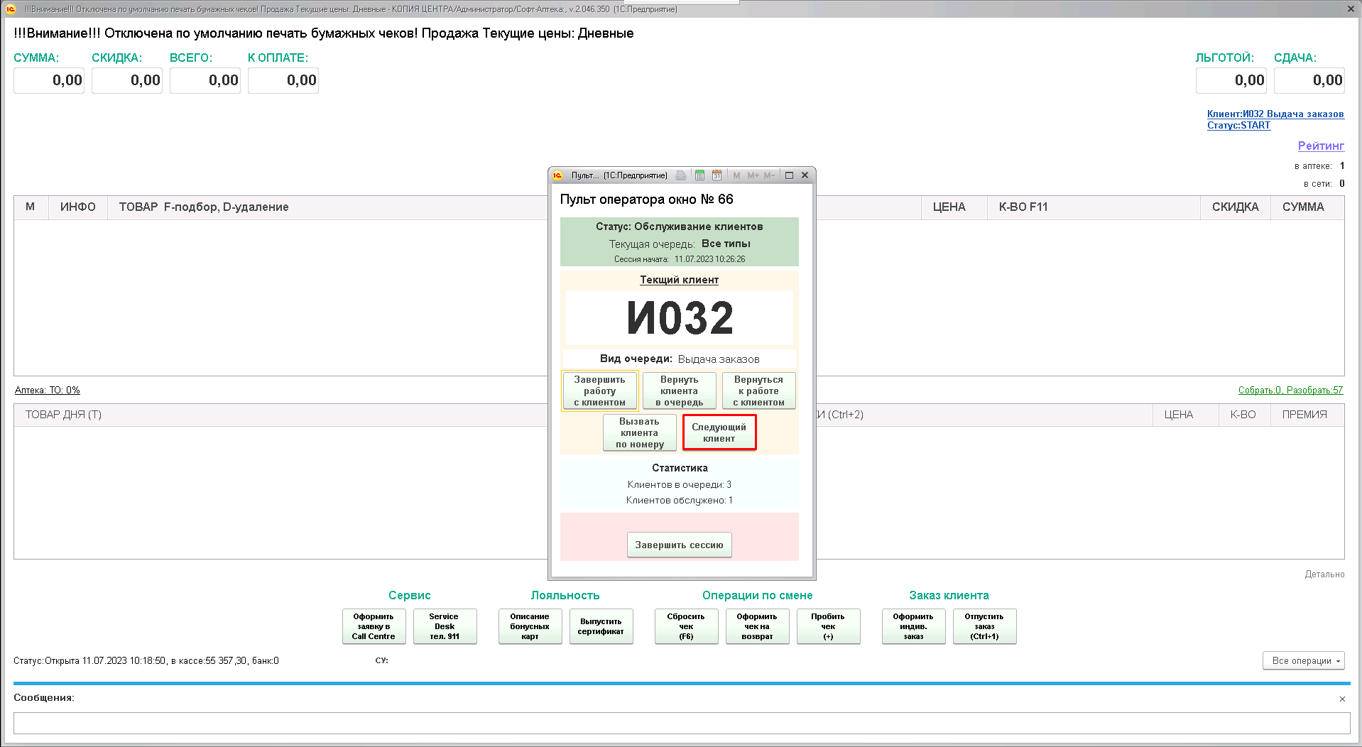 - Для вызова следующего клиента нажмите кнопку «Следующий клиент».