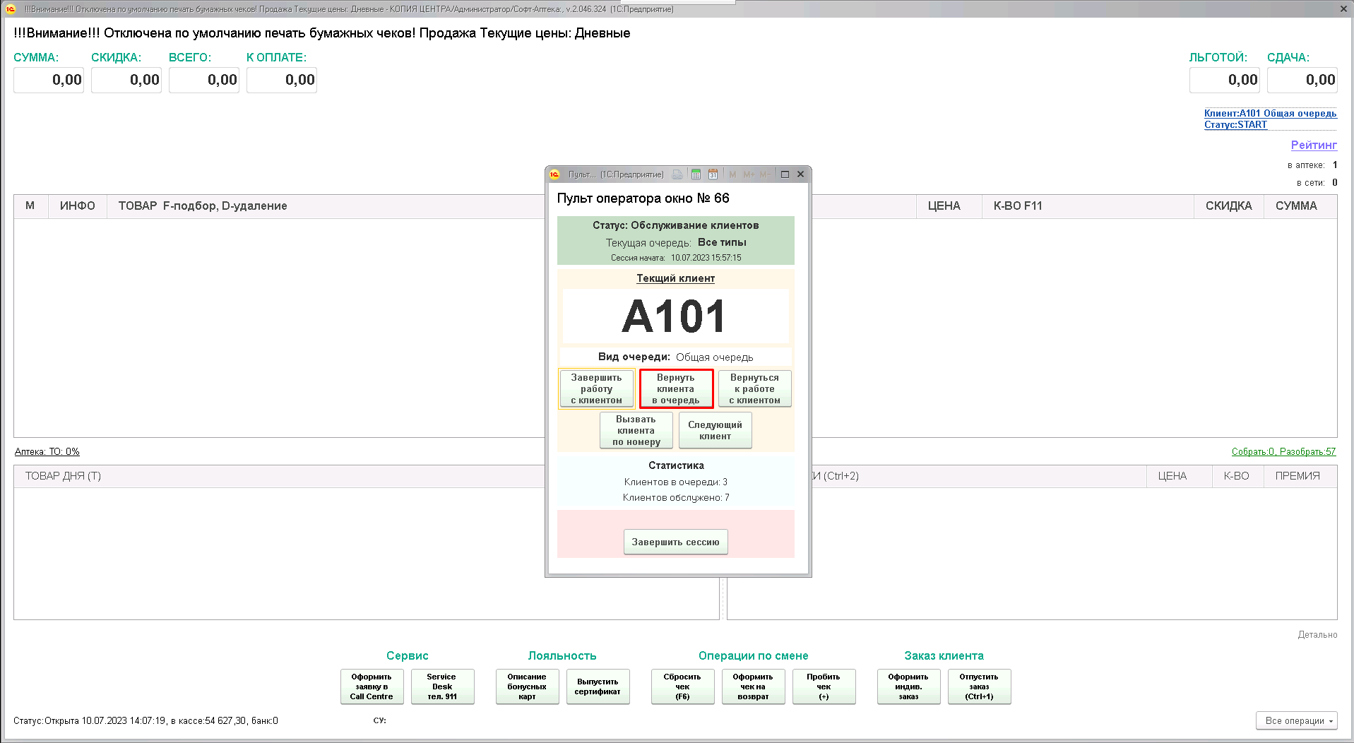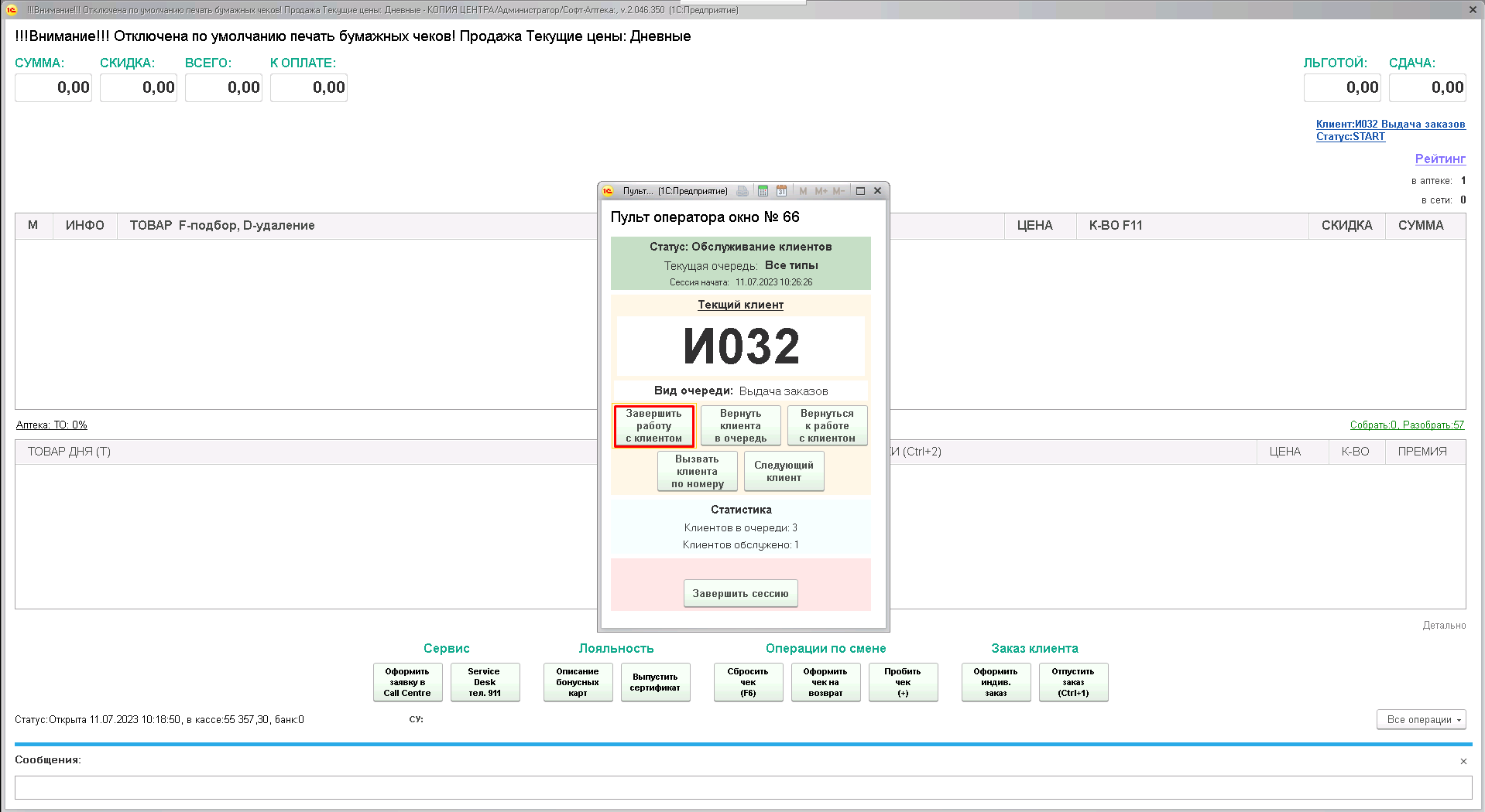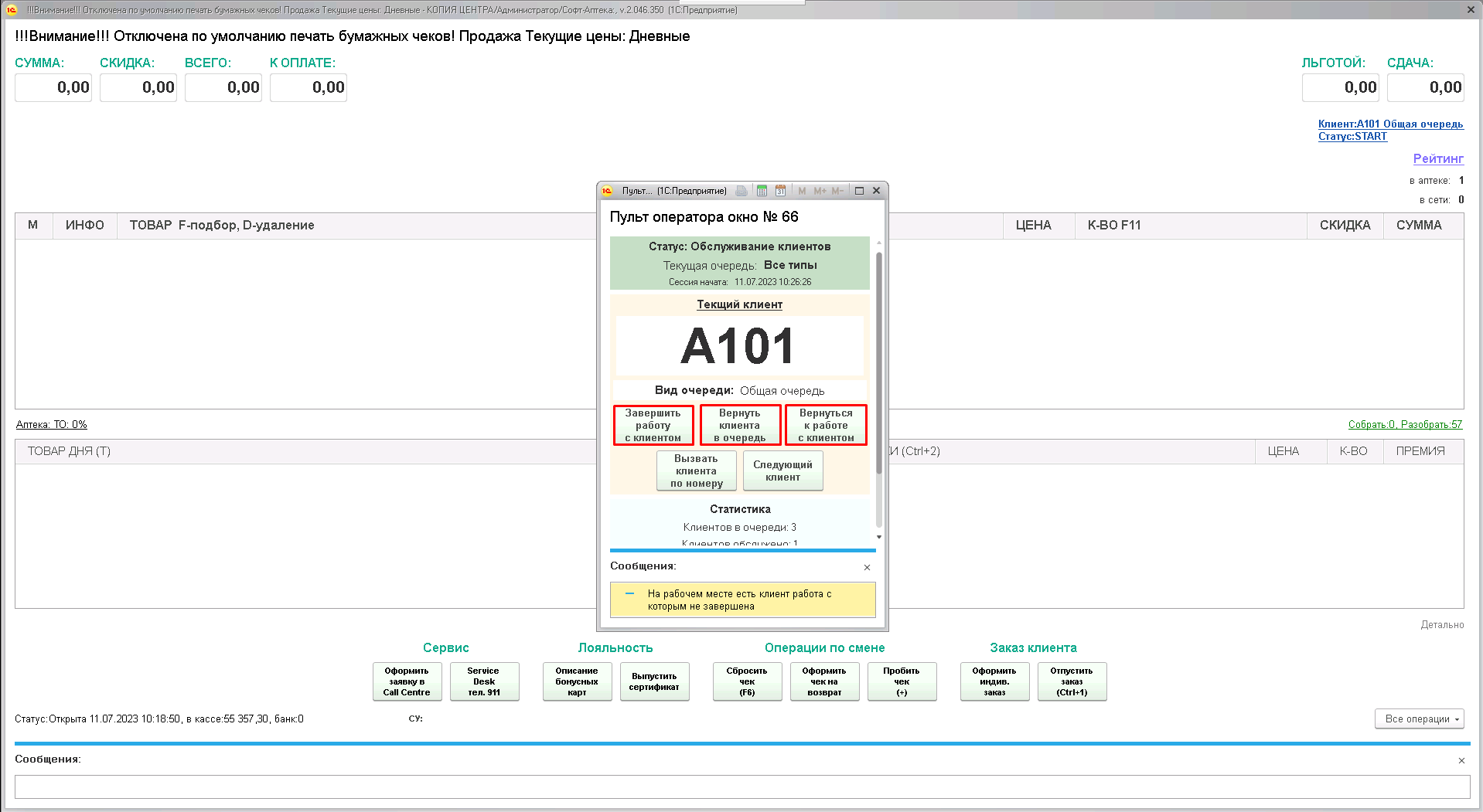 - Вы можете завершить работу с клиентом, вернуть клиента в очередь или продолжить его обслуживание до пробития чека.