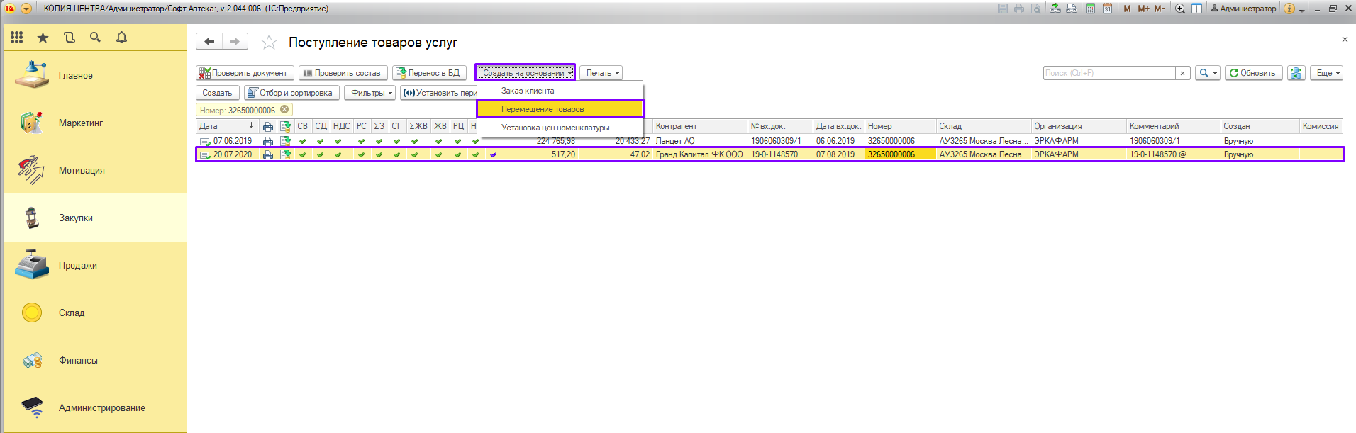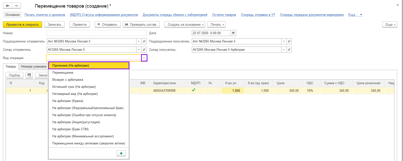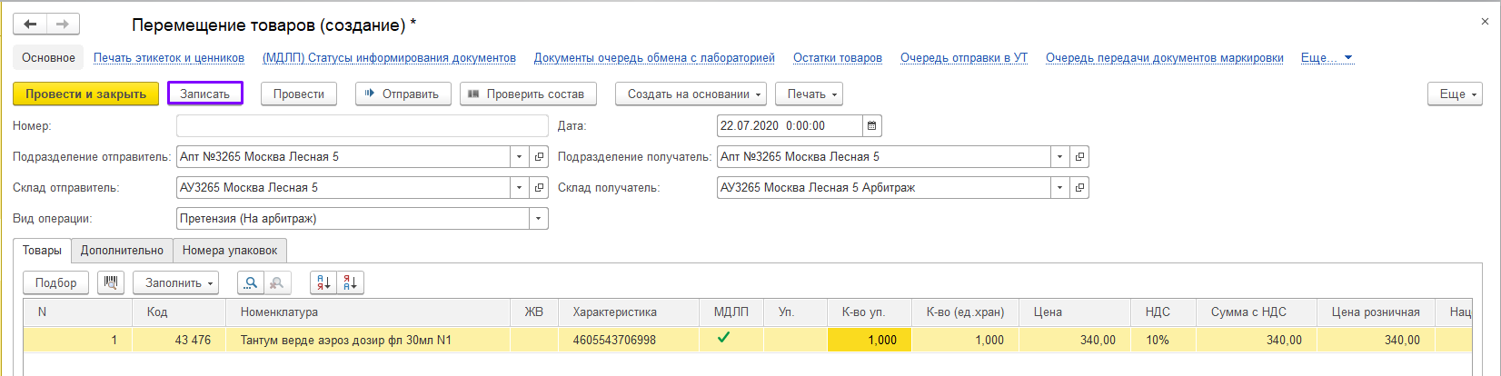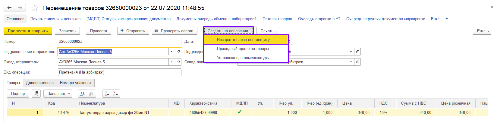 Для начала, нам необходимо перемести возвращаемый товар на арбитраж: нажмите кнопку «Создать на основании» и выберите документ «Перемещение товаров».