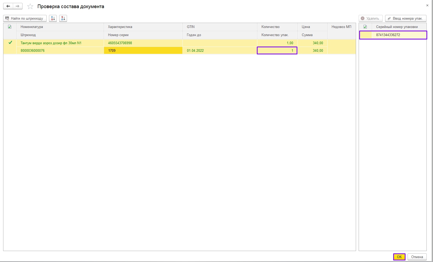 Если товар маркированный отсканируйте Data Matrix код перемещаемого товара в данном окне. После сканирования появится серийный номер упаковки и проставится количество упаковок. По окончанию нажмите кнопку «ОК».