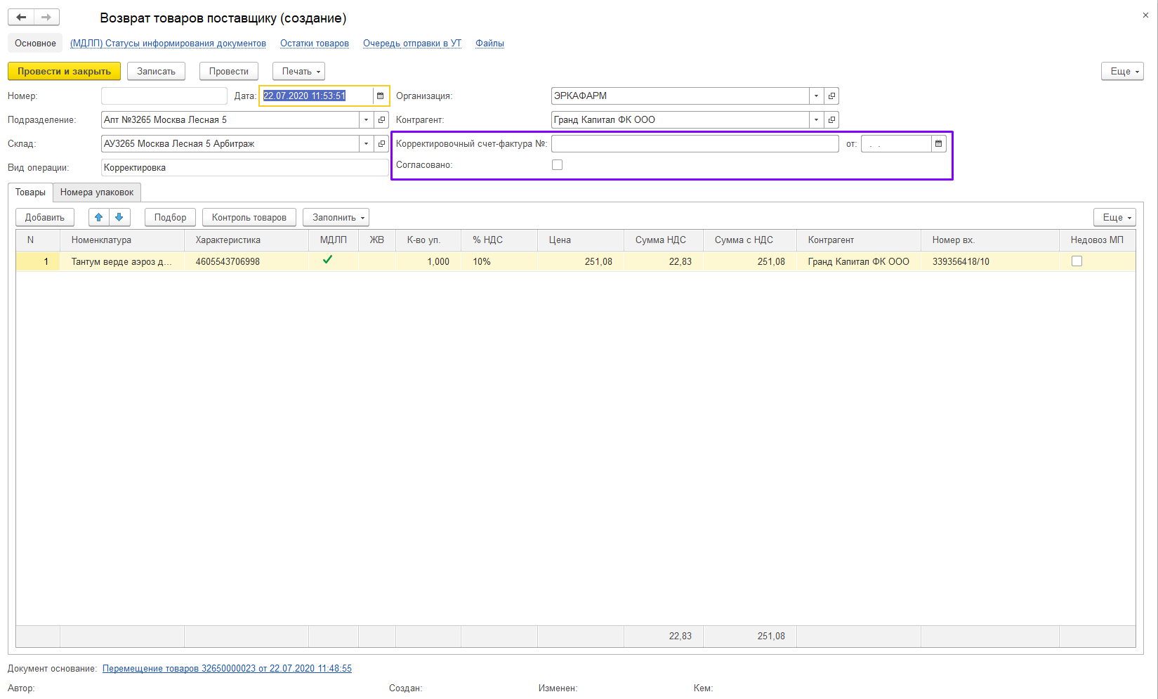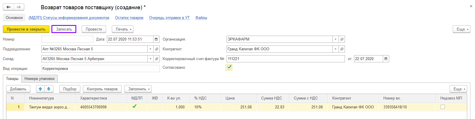 В открывшейся форме создания документа, укажите нужный вид операции и товар в том количестве, которое требуется вернуть поставщику.