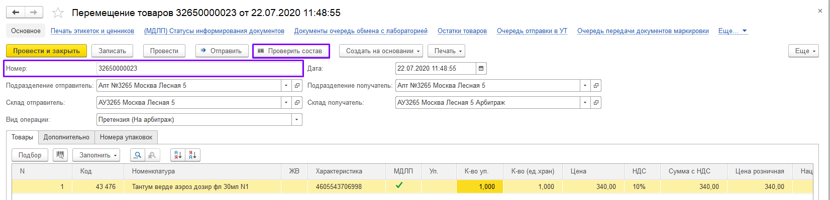 После записи документу присваивается номер. Далее нажмите на кнопку «Проверить состав».