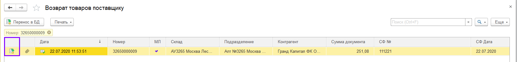 В разделе «Закупки» в журнале документов поступлений товаров и услуг выберите накладную, по которой необходимо сформировать документ «Возврат товаров поставщику».