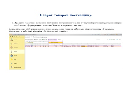 Нажмите кнопку «Создать на основании» и выберите тип документа «Возврат товаров поставщику».