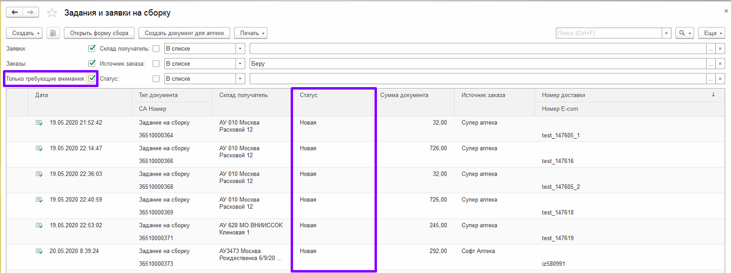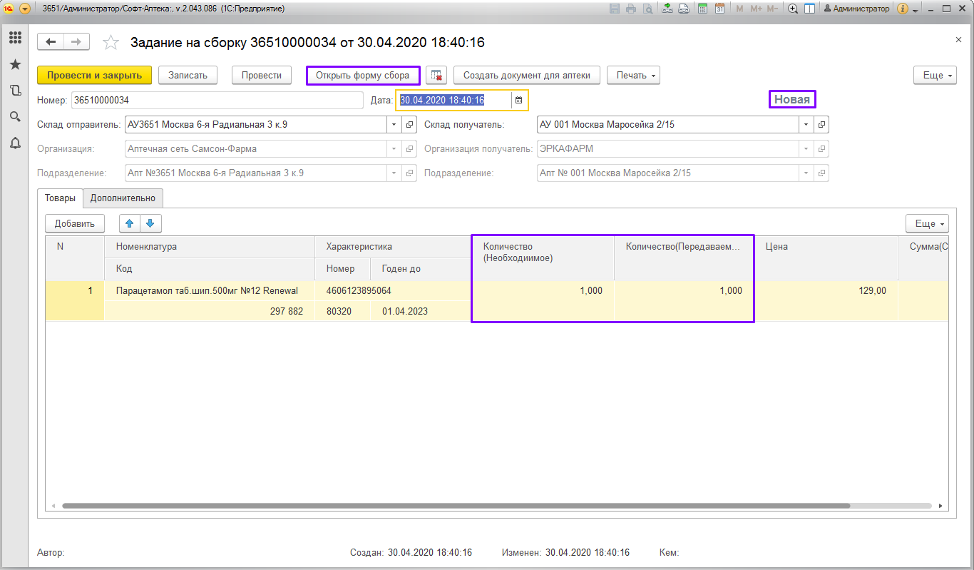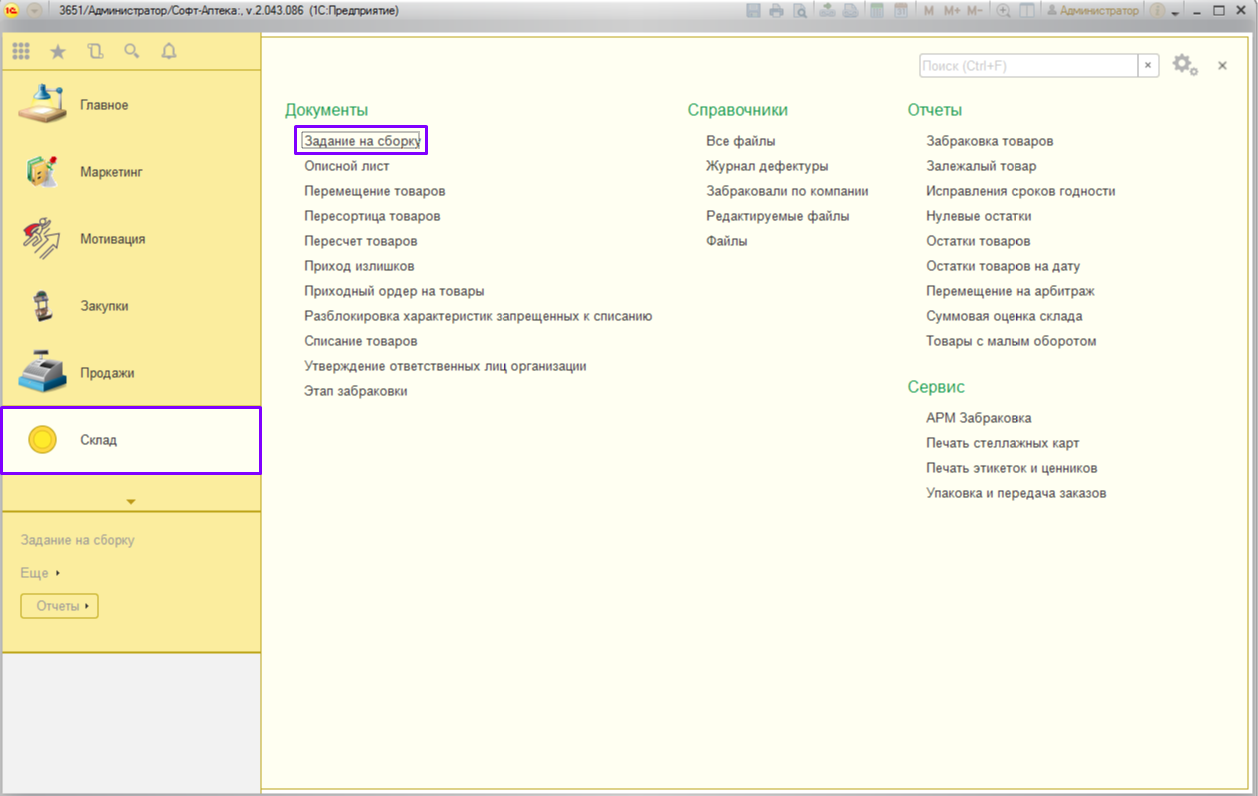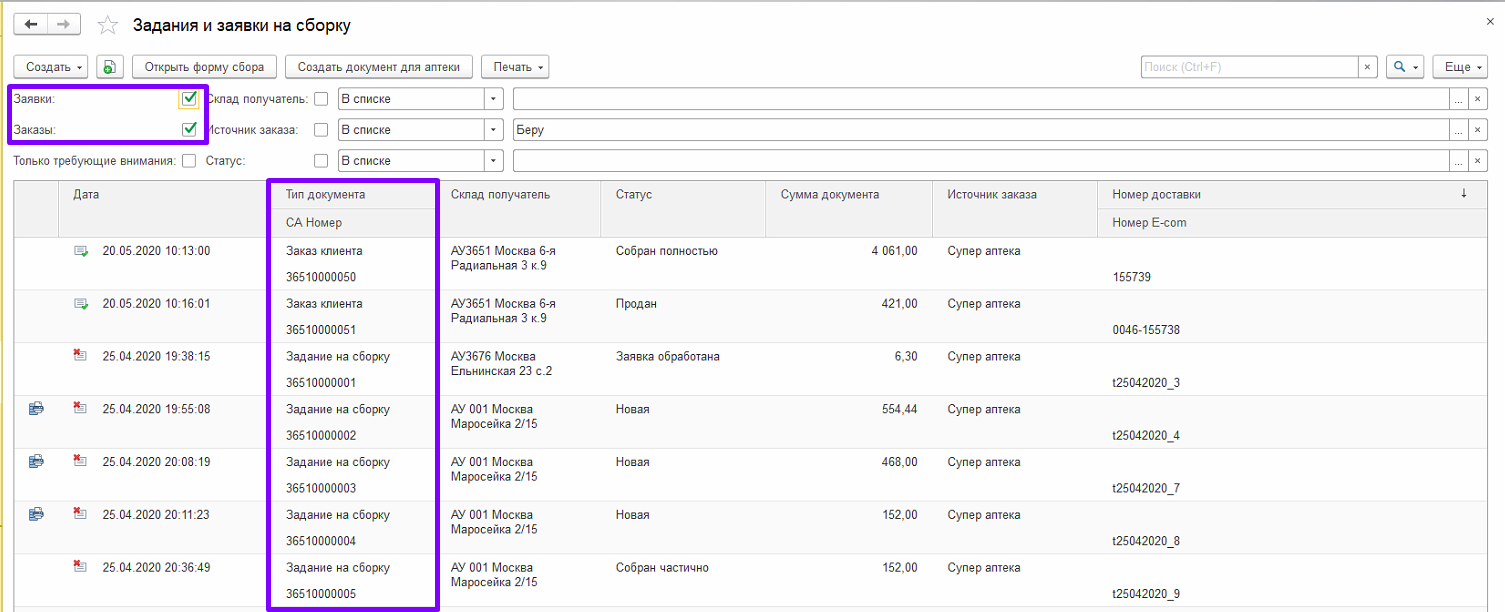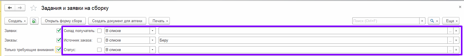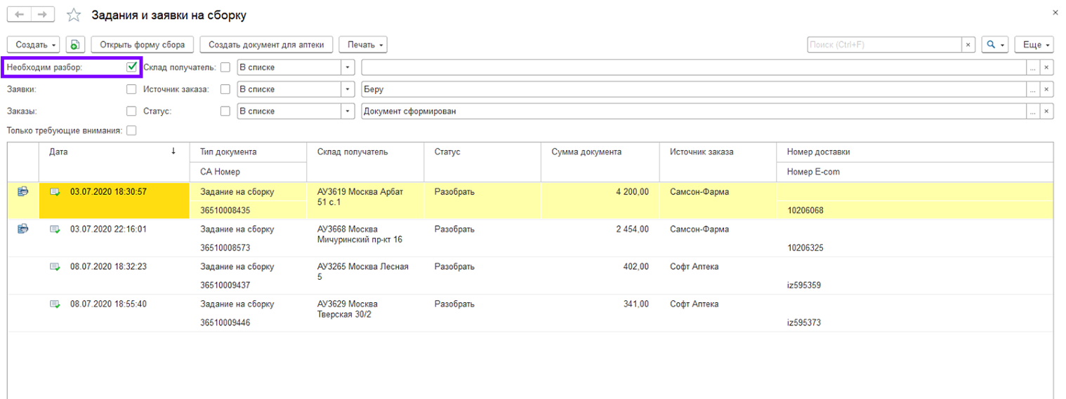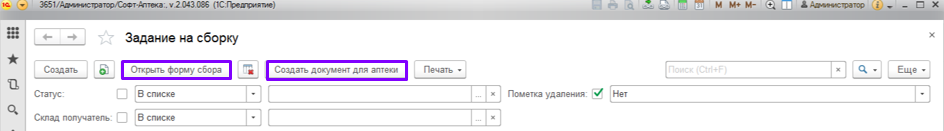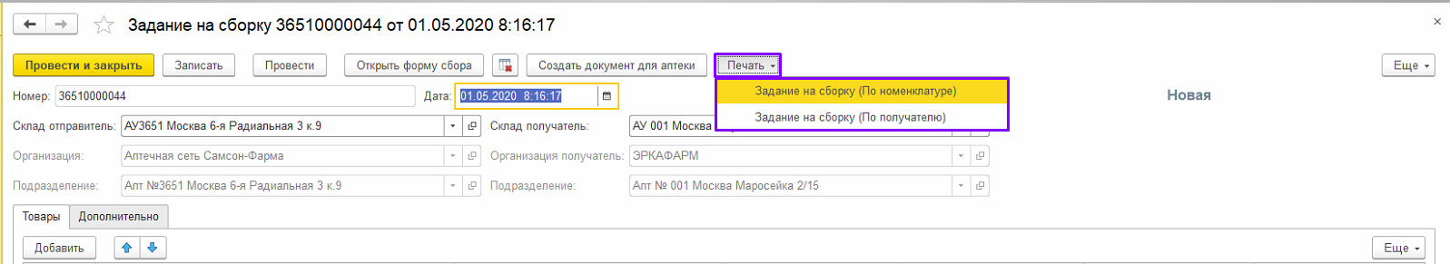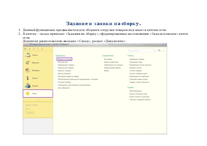 1. Данный функционал предназначен для сборки и отгрузки товаров под заказ в аптеки сети. В аптеку – склад приходят «Задания на сборку», сформированные на основании «Заказа клиента» аптек сети.