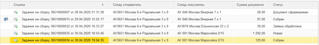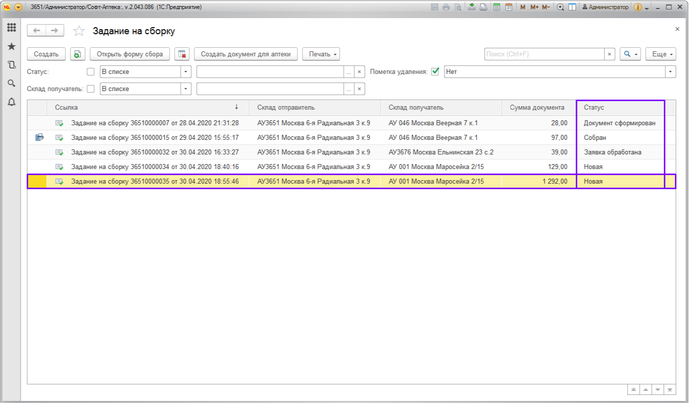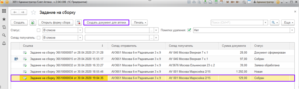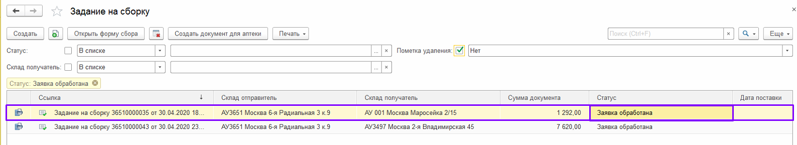 2. В журнале Заданий на сборку представлена информация о номере документа «Задание на сборку» и дате его создания, наименование склада-отправителя и склада-получатель (аптека, для которой собирается товар), сумма документа и статус.