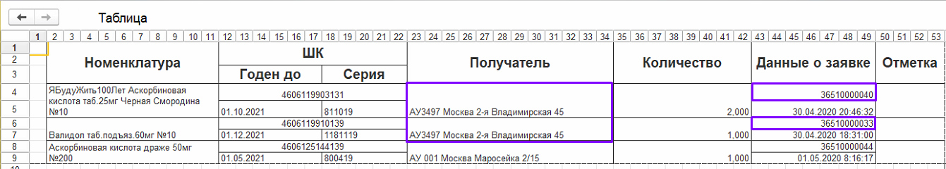 • Второй вариант удобен в случае, если Вы выделяете несколько заказов с разными получателями. В данной печатной форме все заказы по одному получателю будут сгруппированы и имеется возможность формирования единого документа движения.