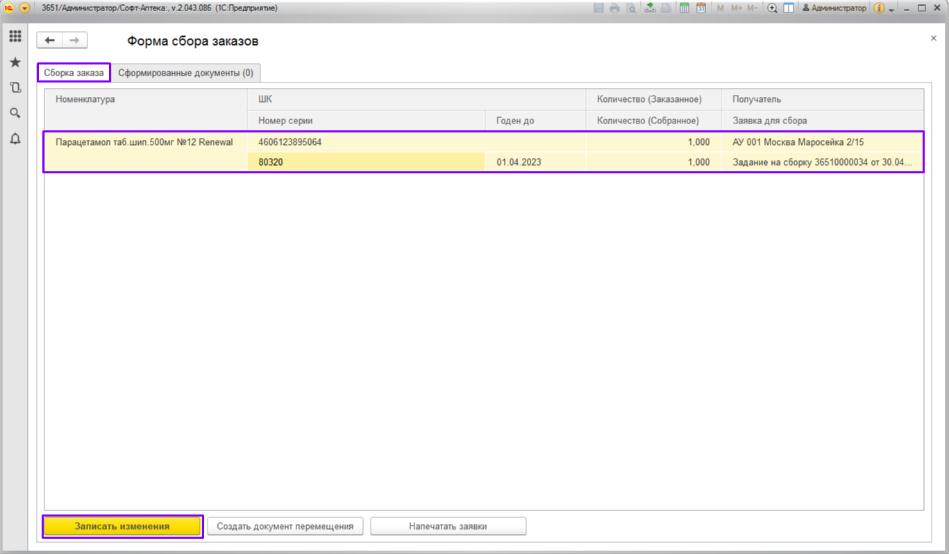 8. После подтверждения сборки заказа, статус «Задания на сборку», изменится на «Собран». На этом этапе требуется сформировать документы движения (перемещение или реализация/поступление на точку получателя).