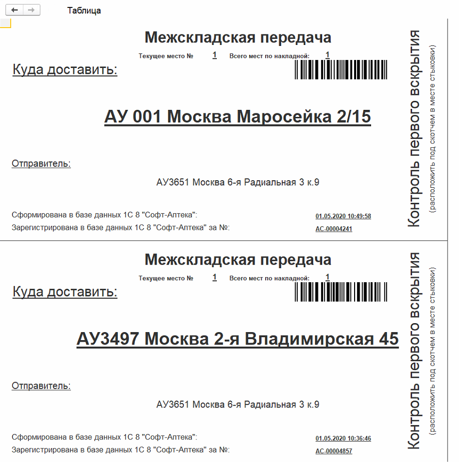 • перемещение – формируется в случае, если аптека-получатель находится в том же юридическом лице, что и аптека-отправитель.