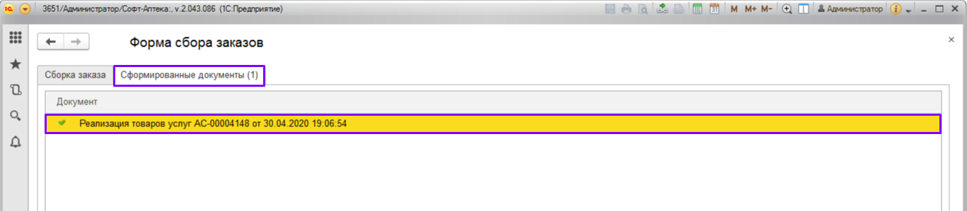 9. Для проверки, нажмите «Открыть форму сбора» и откройте вкладку «Сформированные документы». Здесь будет показан документ движения.