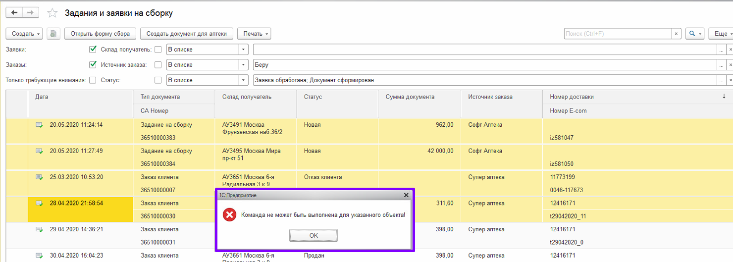 В задания на сборку – все сформированные заявки на товар по заказам других точек аптечной сети.