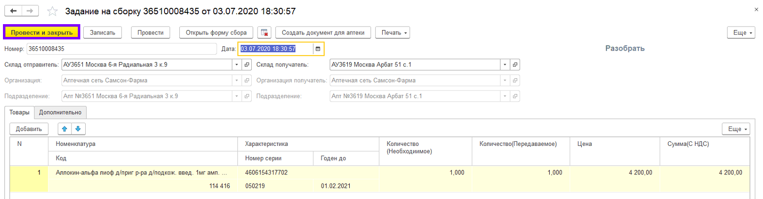 11. Документы движения можно формировать по итогу дня, после полной сборки всех товаров, чтобы в аптеках-получателях не формировался большой объем документов.
