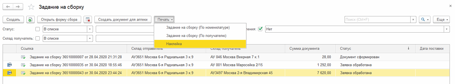 Примечание: Печатные форму соответствуют только документу «Задание на сборку», поэтому, в случае если вы выделили и заказ, и задание, при попытке печати у вас выйдет ошибка.