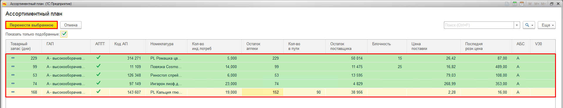 Для переноса выбранных позиций в документ, нажмите кнопку «Перенести выбранное».