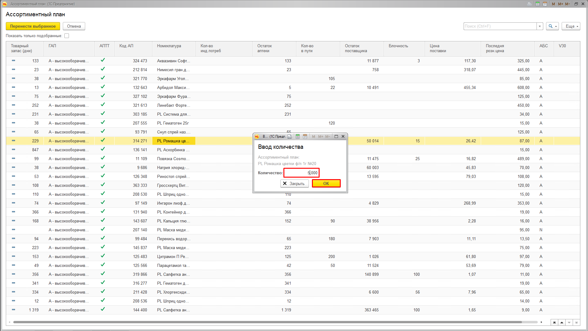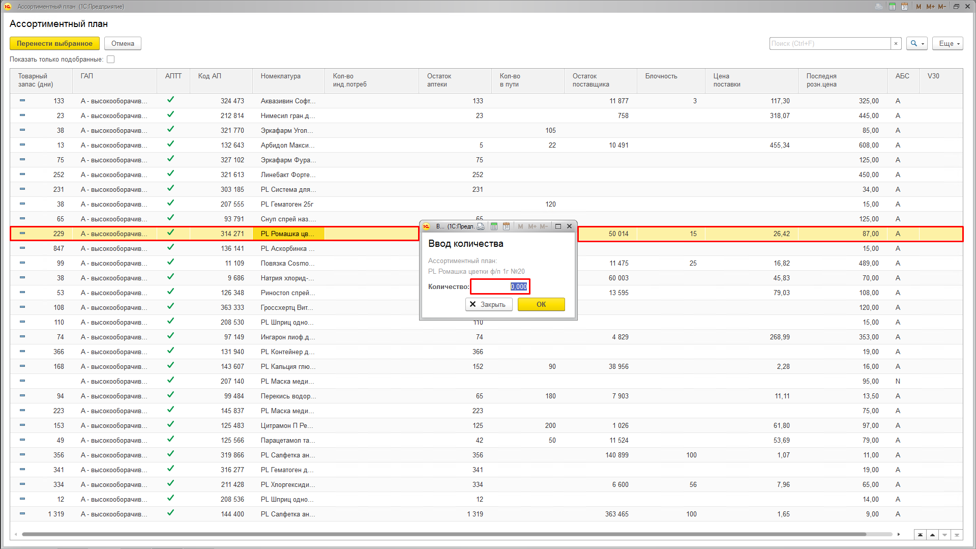 Откроется окно «Ассортиментный план», кликните дважды на требующуюся к заказу позицию.
