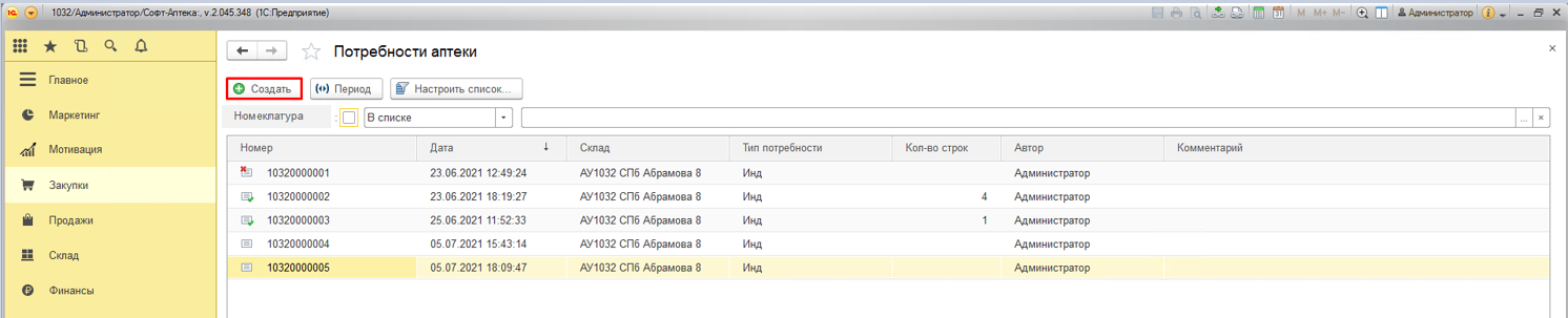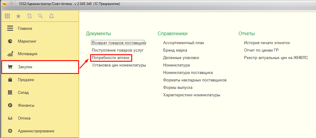 Откройте раздел «Закупки» и выберите документ «Потребности аптеки».