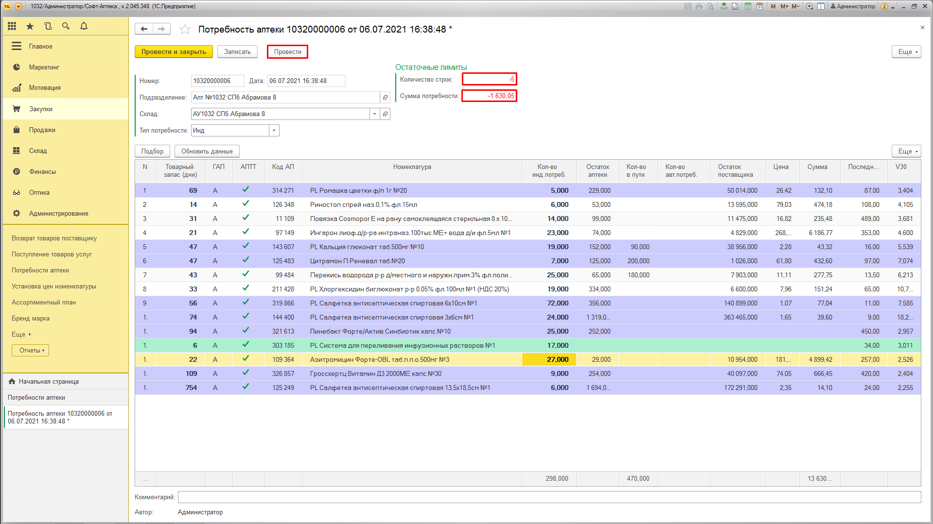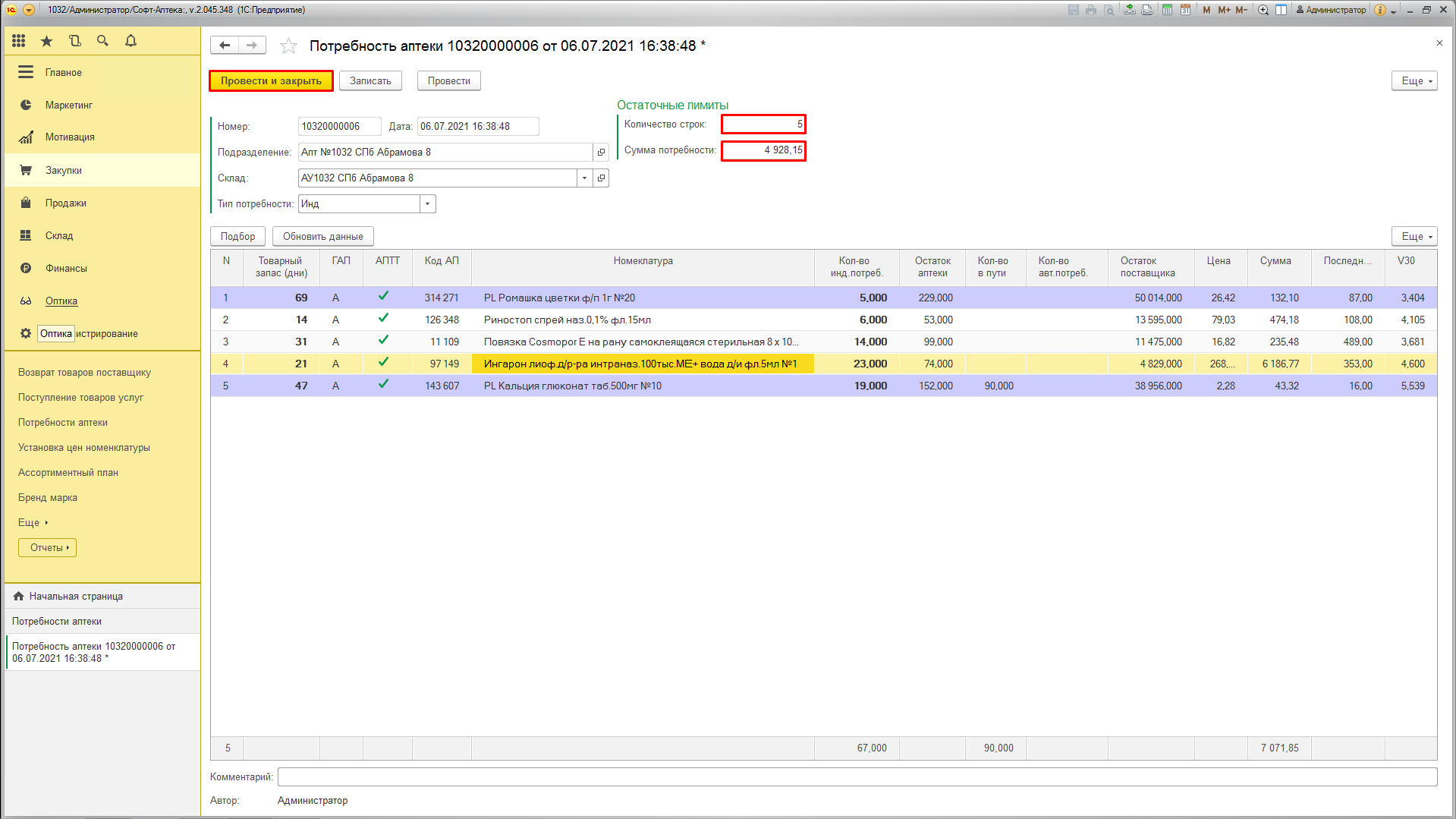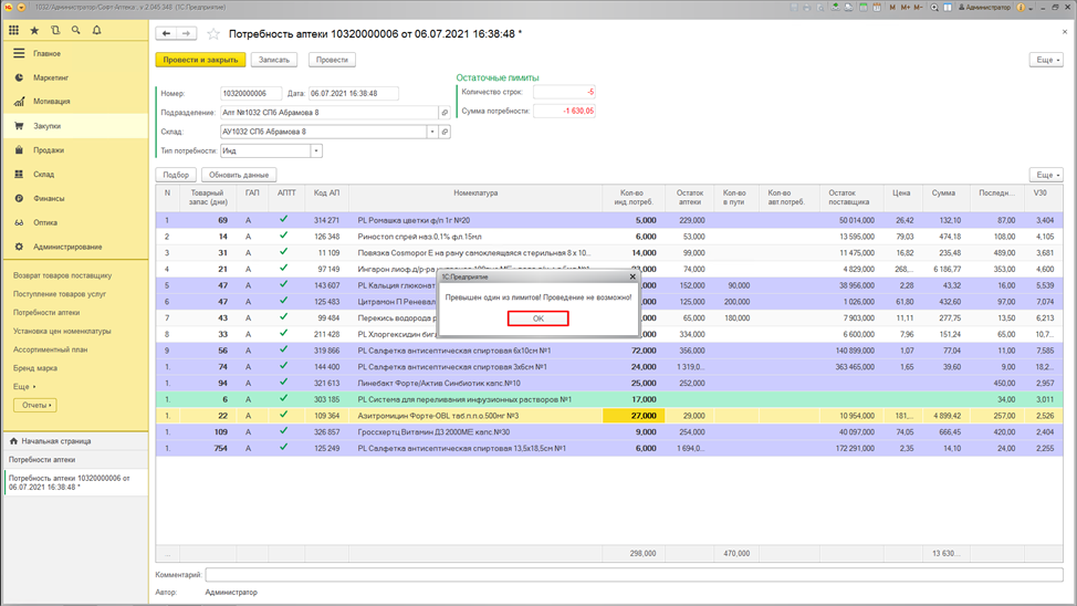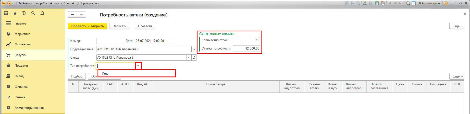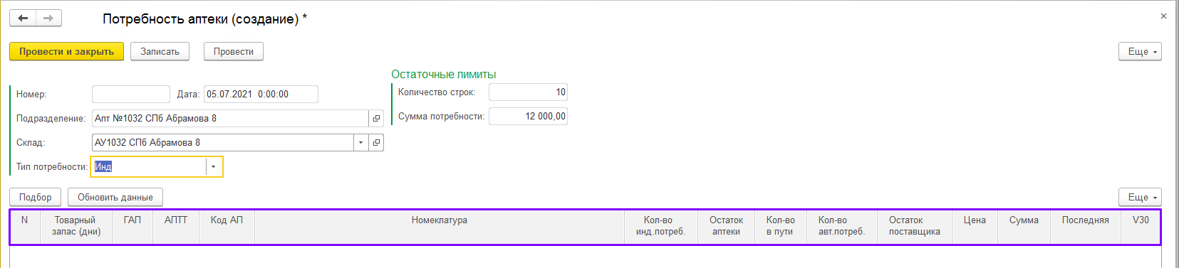 В случае, если Вы не вышли за рамки установленных на вашу аптеку лимитов, система позволит провести документ и оформить индивидуальную потребность. Для этого нажмите кнопку «Провести и закрыть».