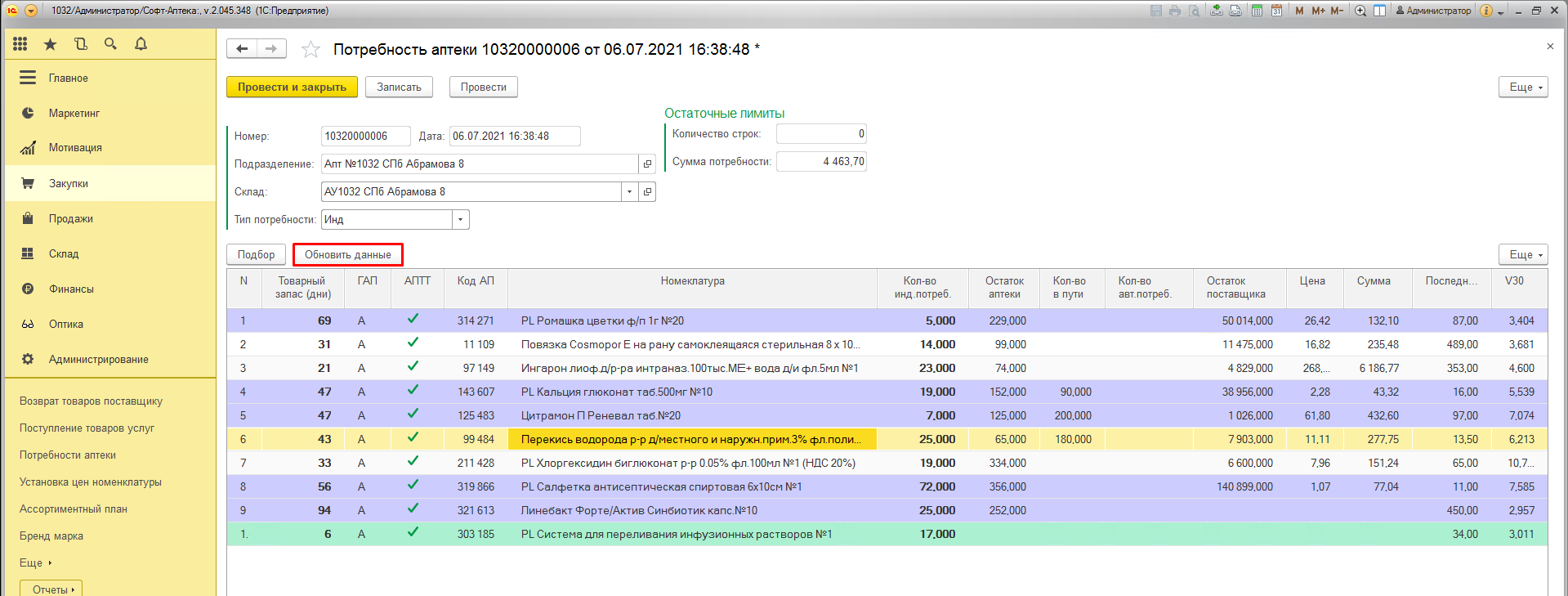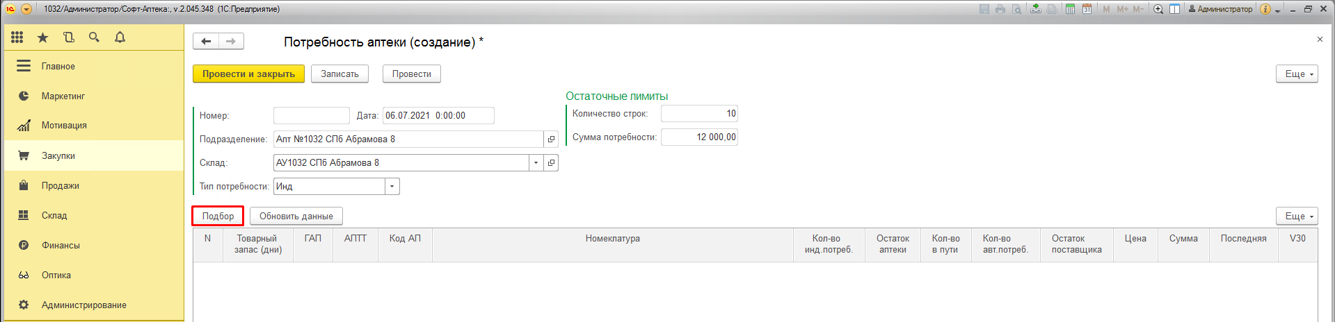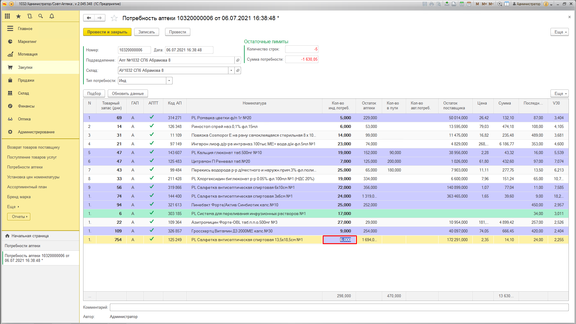 В случае, если Вы не вышли за рамки установленных на вашу аптеку лимитов, система позволит провести документ и оформить индивидуальную потребность. Для этого нажмите кнопку «Провести и закрыть».