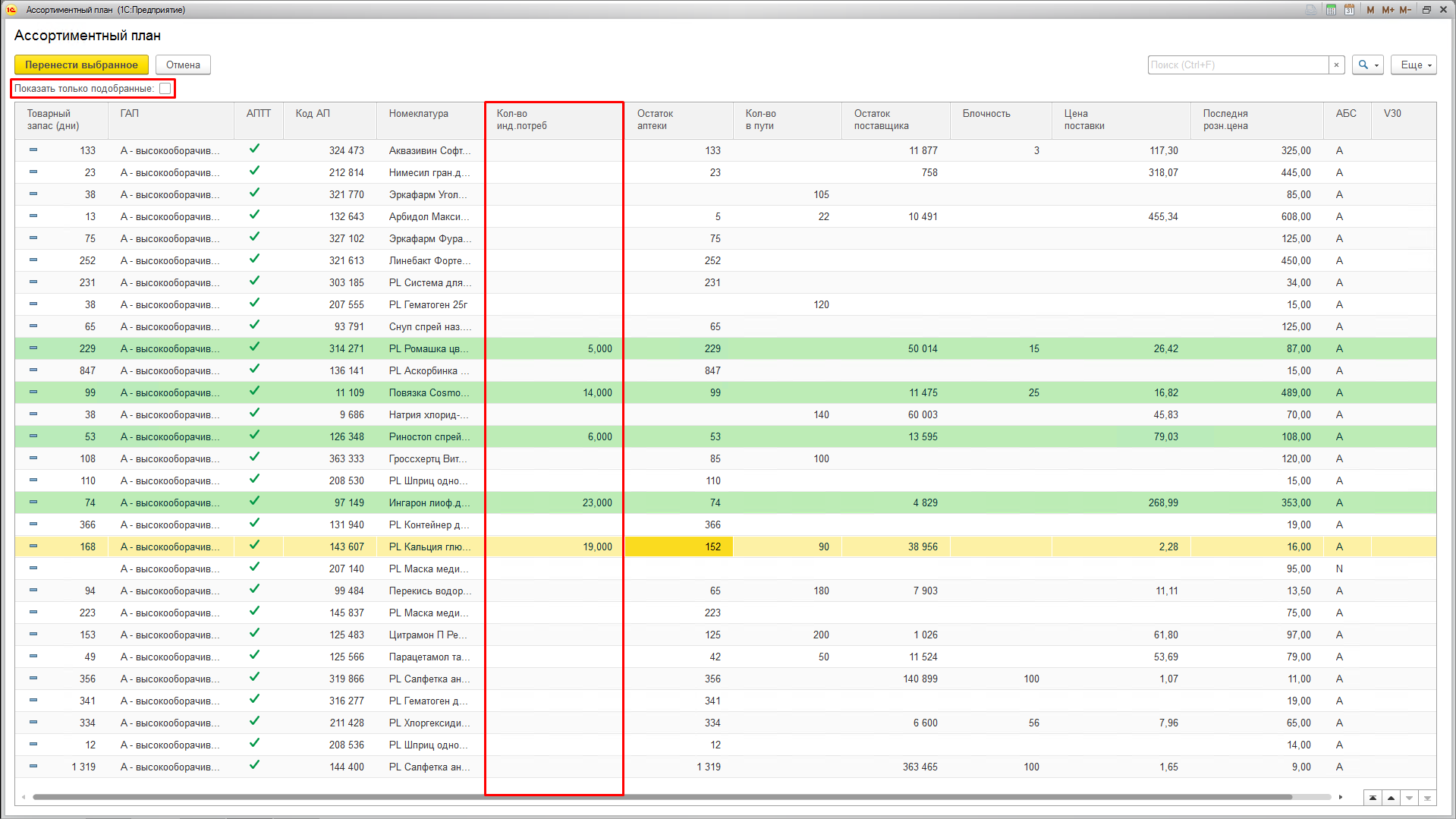 - если запас товара в аптеке меньше 8-ми дней, строка товара будет подсвечена зеленым цветом.