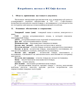 Настоящая инструкция предназначена для руководителей аптек и устанавливает порядок оформления в ПО «1С: Софт-Аптека» потребности аптеки для заказа товара у поставщиков с учетом расчетов по алгоритму автозаказа и пожеланий руководителя аптеки.
