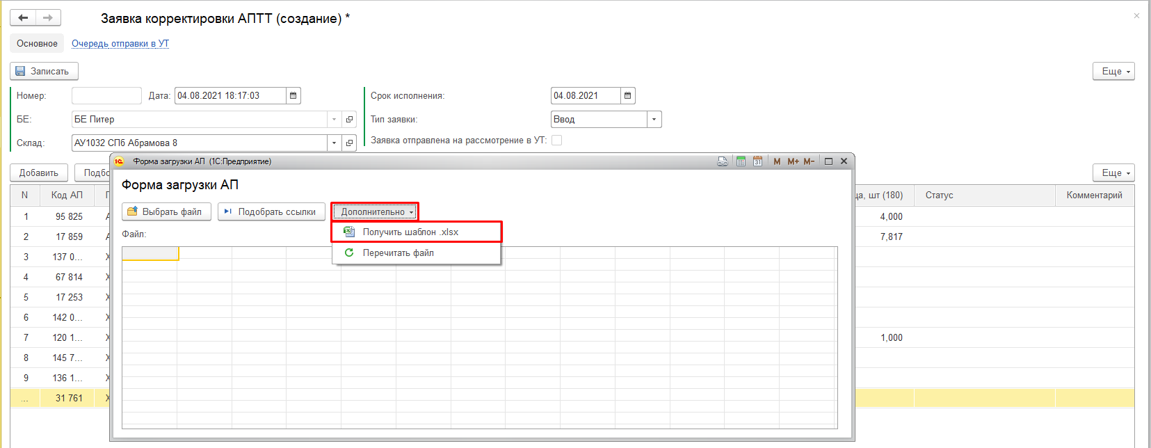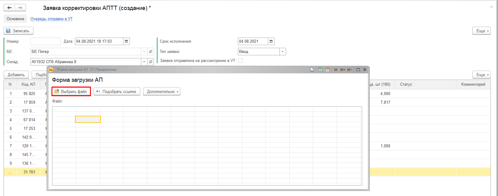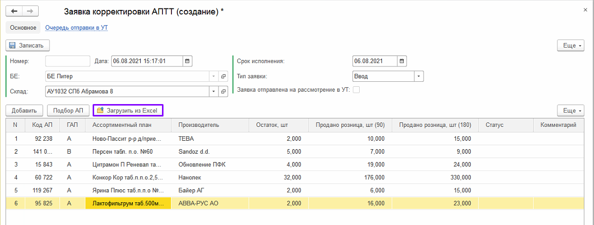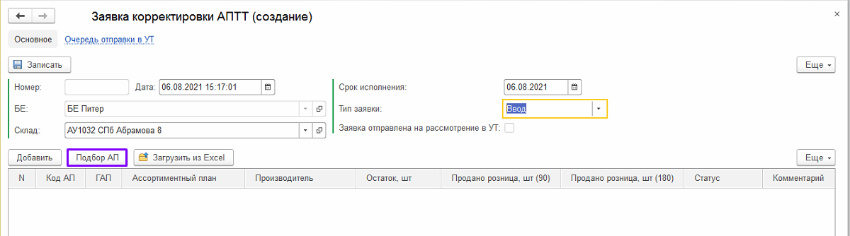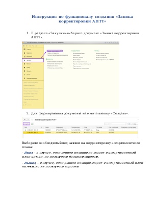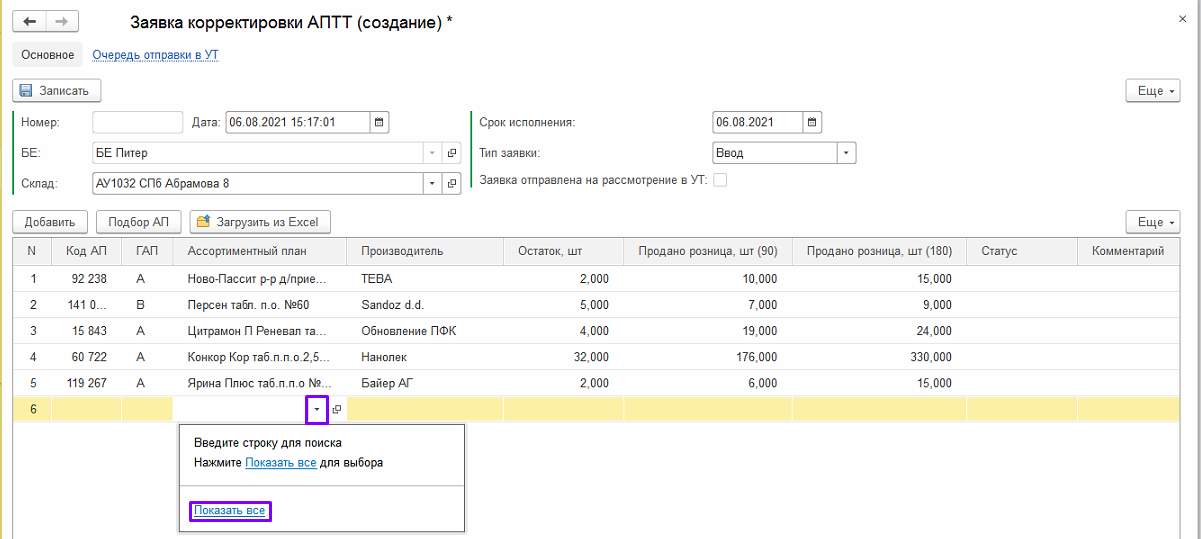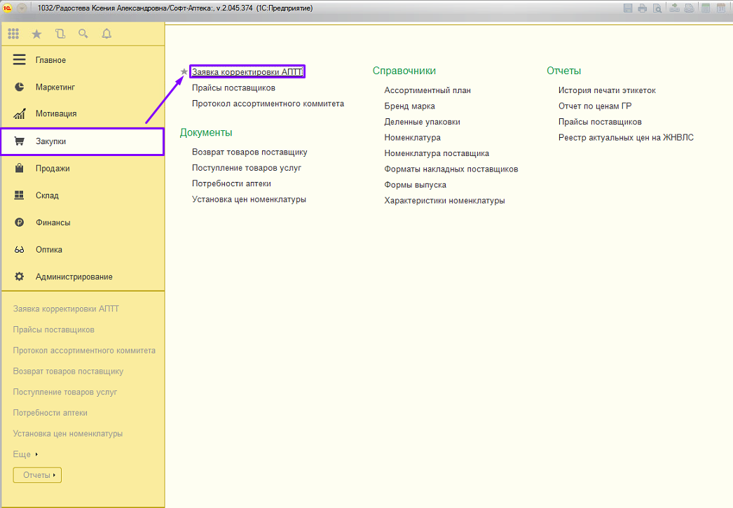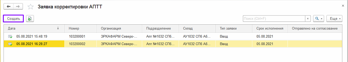 1. В разделе «Закупки» выберите документ «Заявка корректировки АПТТ».